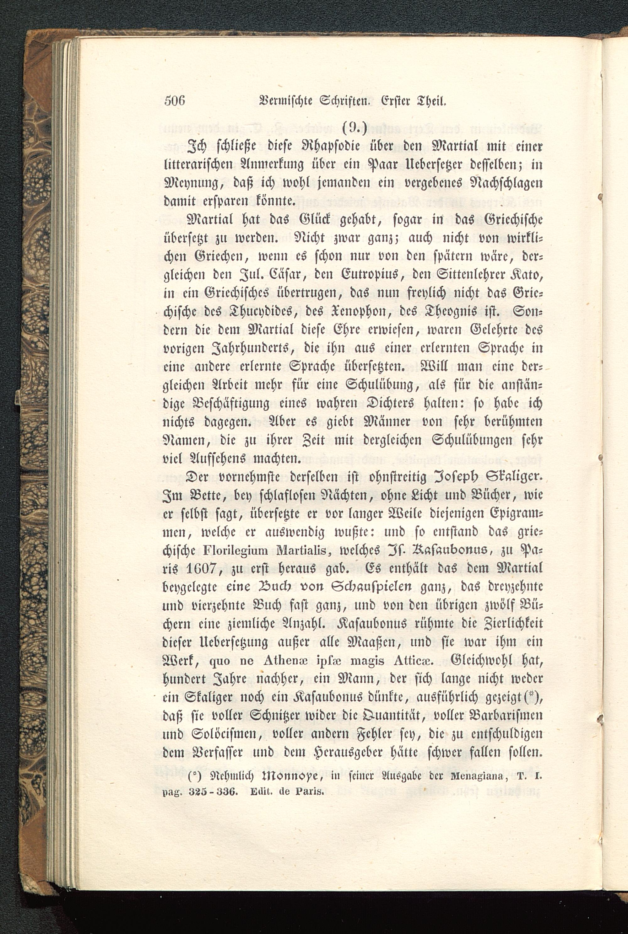 Der vornehmste derselben ist ohnstreitig Ioseph Skaliger .Im Bette, bey schlaflosen Nächten, ohne Licht und Bücher, wieer selbst sagt, übersetzte er vor langer Weile diejenigen Epigram-men, welche er auswendig wußte: und so entstand das grie-chische xiorilvAium Nartialis, welches Is Rasaubonus, zu Pa-ris 1607, zu erst heraus gab. Es enthält das dem Martialbeygelegte eine Buch von Schauspielen ganz, das drcyzchnteund vierzehnte Buch fast ganz, und von den übrigen zwölf Bü-chern eine ziemliche Anzahl. Kasaubonus rühmte die Zierlichkeitdieser Uebersctzung außer alle Maaßen, und sie war ihm einWerk, yuo llv ^tKenN ipti« magis ^ttic-v. Gleichwohl hat,hundert Zahre nachher, ein Mann, der sich lange nicht wederein Skaliger noch ein Kasaubonus dünkte, ausführlich gezeigt ("),daß sie voller Schnitzer wider die Quantität, voller Barbarismenund Solöcismen, voller andern Fehler sey, die zu entschuldigendem Verfasser und dem Herausgeber hätte schwer fallen sollen.
