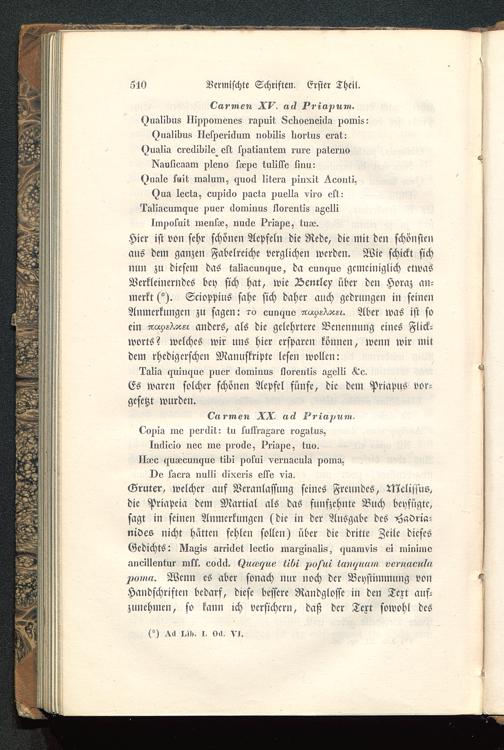 Inclielo nee ine pi-ocke, priane, tuo.Ilvee ^llLeeun^ue 1il»i notui vernaeula nama^De laera iiulli llixeils etle vls.Gruter, welcher auf Bcranlassung seines Freundes, rNelMs,die Priapcia dem Martial als das fünfzehnte Buch beyfügte,sagt in seinen Anmerkungen (die in der Ausgabe des -Hadria-nides nicht hätten fehlen sollen) über die dritte Zeile diesesGedichts: UaZis iunclot lectio mai'Ainalis, «juamvis ei minimoirneülontur mll. evllll. (^e««^?«« ve?»«<??«/stWenn es aber sonach nur noch der Vcystimmung vonHandschriften bedarf, diese bessere Randglosse in den Text auf-zunehmen, so kann ich versichern, daß der Text sowohl des