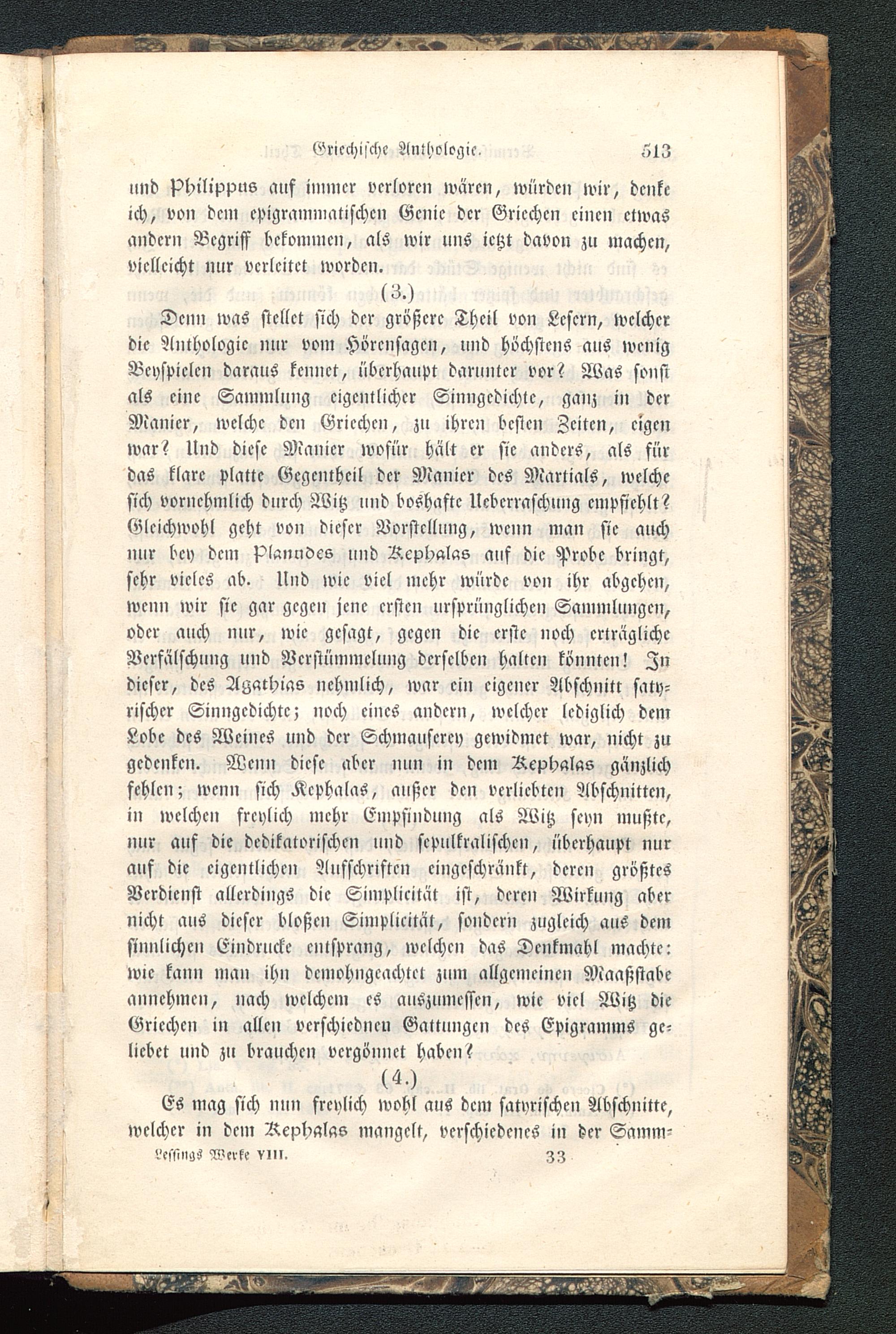 Denn was stellet sich der größere Theil von Lesern, welcherdie Anthologie nur vom Hörensagen, und höchstens aus wenigBeyspielen daraus kennet, überhaupt darunter vor? Was sonstals eine Sammlung eigentlicher Sinngedichte, ganz in derManier, welche den Griechen, zu ihren besten Zeiten, eigenwar? Und diese Manier wofür hält er sie anders, als fürdas klare platte Gegentheil der Manier des Martials, welchesich vornehmlich durch Witz und boshafte Ucbcrraschung empfiehlt?Gleichwohl geht von dieser Vorstellung, wenn man sie auchnur bey dem Planndes und Äcphalas auf die Probe bringt,sehr vieles ab. Und wie viel mehr würde von ihr abgehen,wenn wir sie gar gegen jene ersten ursprünglichen Sammlungen,oder auch nur, wie gesagt, gegen die erste noch erträglicheVerfälschung und Verstümmelung derselben halten könnten! Zndieser, des Agathias nehmlich, war ein eigener Abschnitt saty-rischcr Sinngedichte; noch eines andern, welcher lediglich demLobe des Weines und der Schmauscrey gewidmet war, nicht zugedenken. Wenn diese aber nun in dem Rcphalas gänzlichfehlen; wenn sich Kcphalas, außer den verliebten Abschnitten,in welchen freylich mehr Empfindung als Witz seyn mußte,nur auf die dcdikatorischcn und scpulkralischcn, überhaupt nurauf die eigentlichen Aufschriften eingeschränkt, deren größtesVerdienst allerdings die Simplicität ist, deren Wirkung abernicht aus dieser bloßen Simplicität, sondern zugleich aus demsinnlichen Eindrucke entsprang, welchen das Denkmahl machte:wie kann man ihn dcmohngeachtet zum allgemeinen Maaßstabeannehmen, nach welchem es auszumesscn, wie viel Witz dieGriechen in allen vcrschicdncu Gattungen des Epigramms ge-licbct und zu brauchen vergönnet haben?