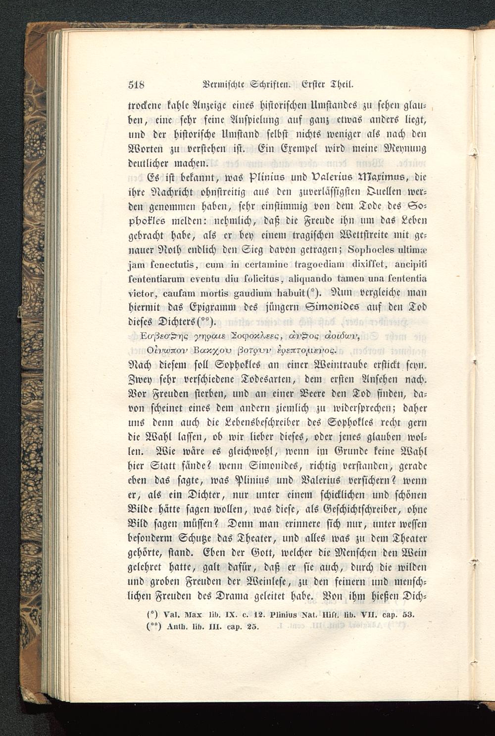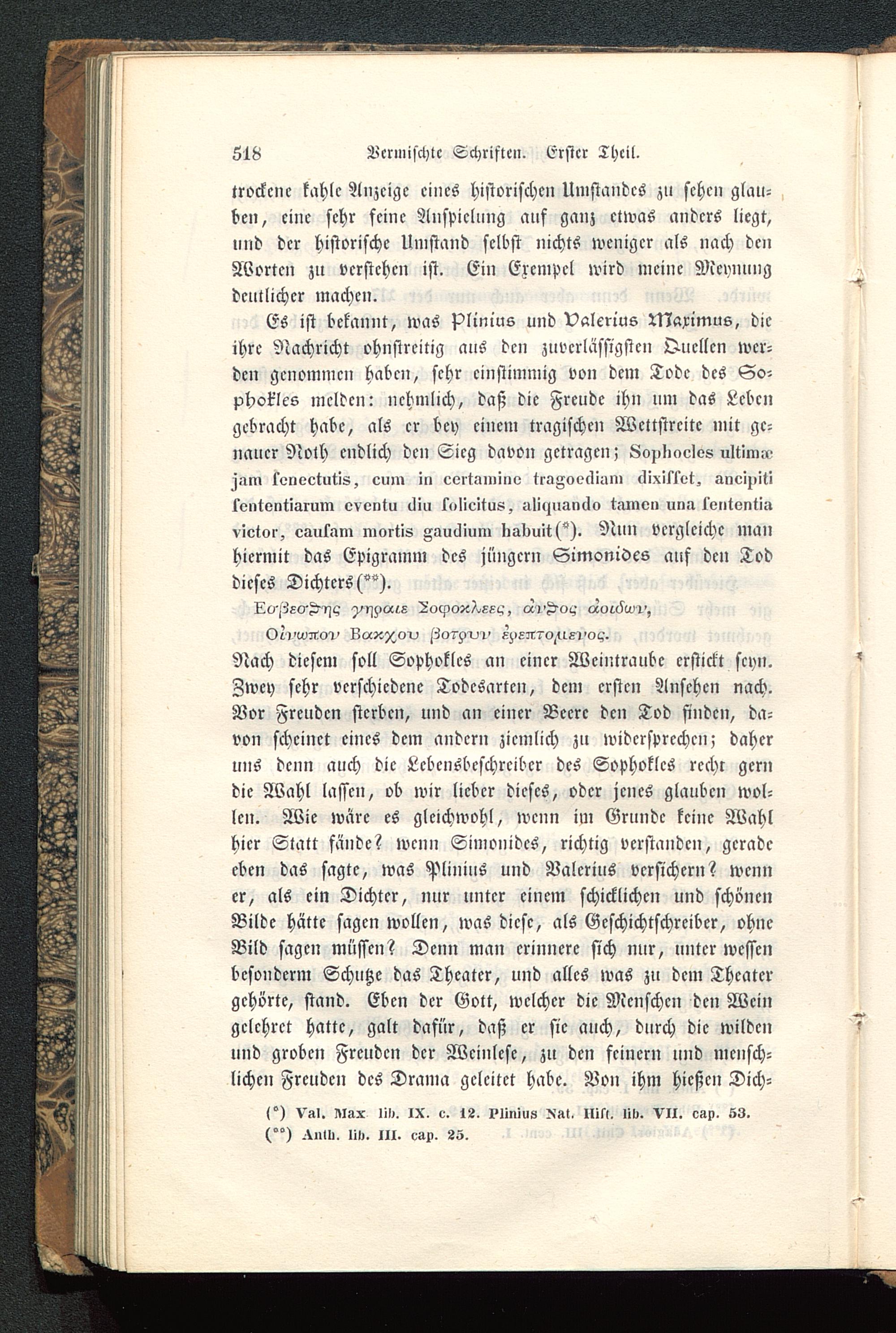 Es ist bekannt, was Plinius und Valcrius N7aximus, dieihre Nachricht ohnstreitig aus den zuverlässigsten Quellen wer-den genommen haben, sehr einstimmig von dem Tode des So-phokles melden: nehmlich, daß die Freude ihn um das Lebengebracht habe, als er bey einem tragischen Wettstreite mit ge-nauer Noth endlich den Sieg davon getragen; 8or<lineles ultim»'^jam tLnoetutis, eum in certamin<z rraFoocu'um ciixistvt, sneijntilentvntisrum vvontu u°iu solic'itus, ülitnmnclo tamvn una l'oiitontii»vietor, c-lutam mortis Zauclium l>i»buit(°). Nun vergleiche manhiermit das Epigramm des jungem Simonides auf den Toddieses Dichters (««).