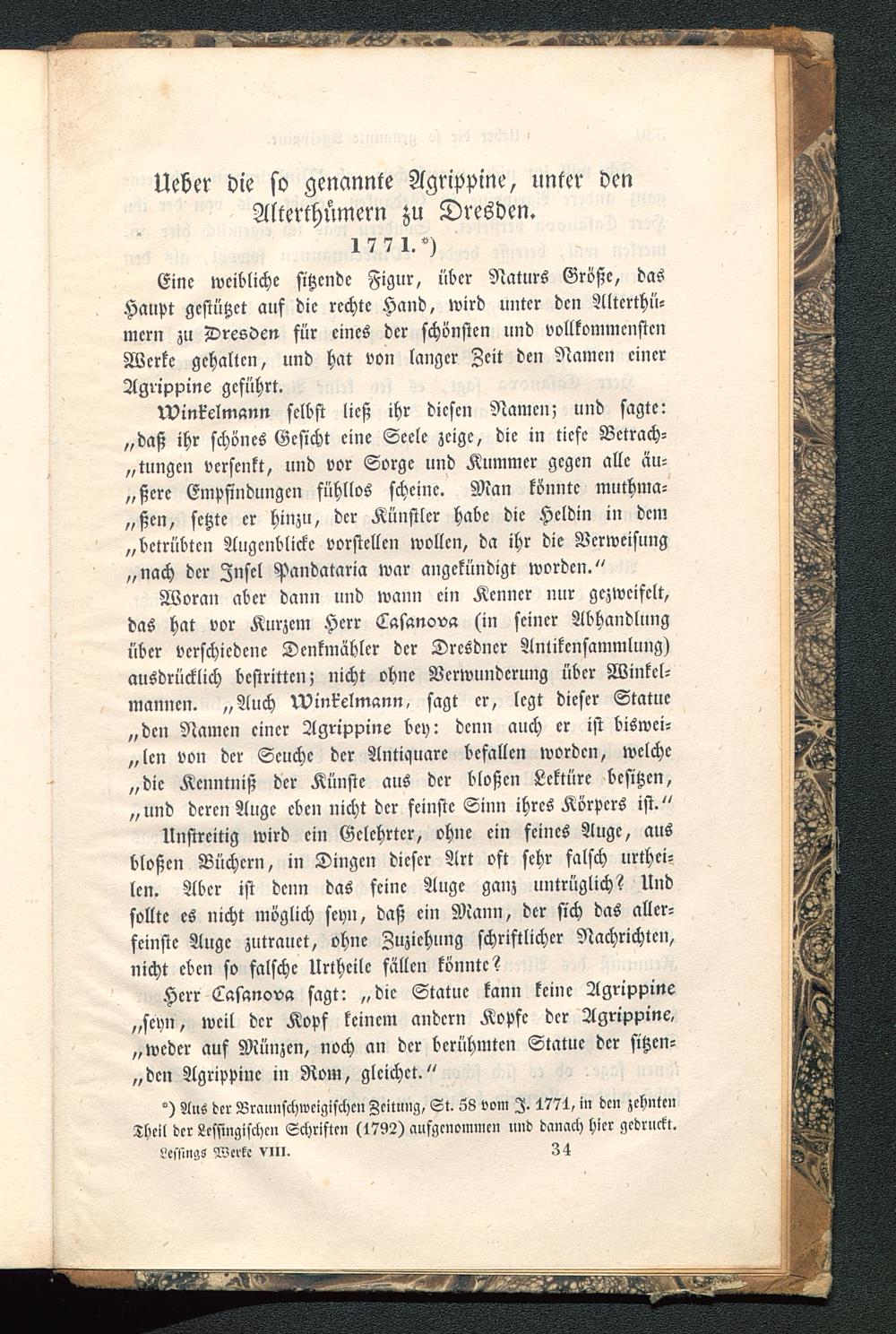 Woran aber dann und wann ein Kenner nur gezweifelt,das hat vor Kurzem Herr Lasanov« sin seiner Abhandlungüber verschiedene Denkmähler der Dresdner Antikensammlung)ausdrücklich vestrittcn; nicht ohne Verwunderung über Winkel-manncn. „Auch Vvinr'elmann, sagt er, legt dieser Statue„den Namen einer Agrippine bey: denn auch er ist biswei-len von der Seuche der Antiquare befallen worden, welche„die Kenntniß der Künste aus der bloßen Lektüre besitzen,„und deren Auge eben nicht der feinste Sinn ihres Körpers ist."