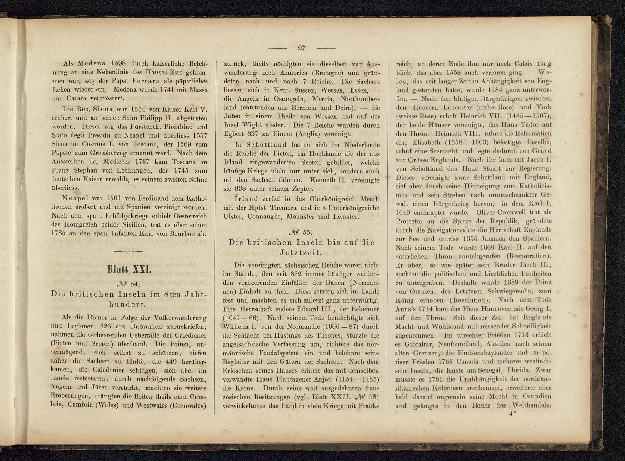 reich, an deren Ende ihm nur noch Calais übrigblich, das aber 1558 auch verloren ging. — Wa-les, das seit langer Zeit in Abhängigkeit von Eng-land gestanden hatte, wurde 1284 ganz unterwor-fen. — Nach den blutigen Bürgerkriegen zwischenden Häusern Lancaster (rothe Rose) und York (weisse Rose) erhob Heinrich VII. (1485 — 1507),der beide Häuser vereinigte, das Haus Tudor aufden Thron. Heinrich VIII. führte die Reformationein, Elisabeth (1558 — 1603) befestigte dieselbe,schuf eine Seemacht und legte dadurch den Grundzur Grösse Englands. Nach ihr kam mit Jacob I. von Schottland das Haus Stuart zur Regierung.Dieses vereinigte zwar Schottland mit England ,rief aber durch seine Hinneigung zum Katholicis-mus und sein Streben nach unumschränkter Ge-walt einen Kürgerkrieg hervor, in dem Karl I. 1649 enthauptet wurde. Oliver Cromwell trat alsProtector an die Spitze der Republik , gründetedurch die Navigationsakte die Herrschaft Englands zur See und entriss 1655 Jamaica den Spaniern.Nach seinem Tode wurde 1660 Karl IL auf denväterlichen Thron zurückgerufen (Eestauration).Er aber, so wie später sein Bruder Jacob IL,suchten die politischen und kirchlichen Freiheitenzu untergraben. Deshalb wurde 1689 der Prinzvon Oranien, des Letzteren Schwiegersohn, zumKönig erhoben (Revolution). Nach dem TodeAnna's 1714 kam das Haus Hannover mit Georg I. auf den Thron. Seit dieser Zeit hat Englands Macht und Wohlstand mit reissender Schnelligkeitzug-enommen. Im utrechter Frieden 1713 erhielt
