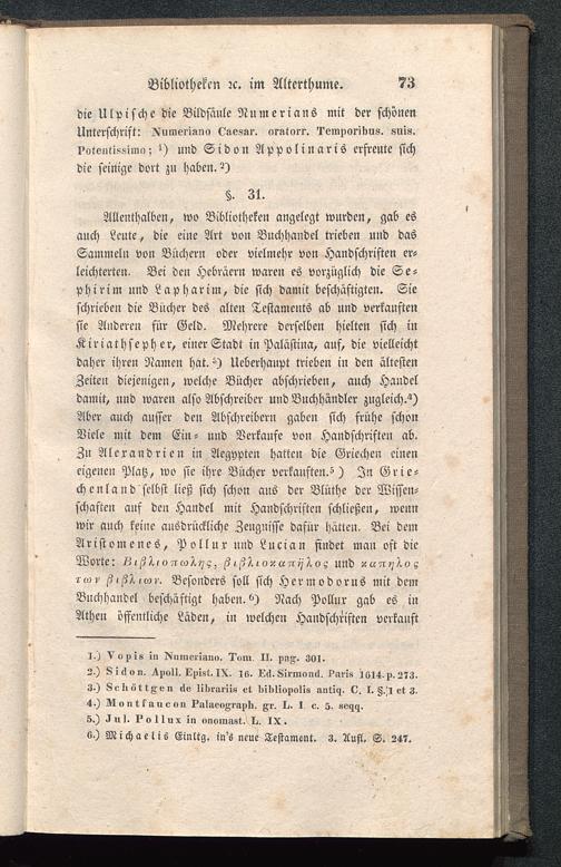 Allenthalben, wo Bibliotheken angelegt wurden, gab esauch Leute, die eiue Art von Buchhandel trieben uud dasSammeln von Büchern oder vielmehr von Handschriften er-leichterten. Bei den Hebräern waren es vorzüglich die Se-phirim und Lav harnn, die sich damit beschäftigten. Sieschrieben die Bücher des alten Testaments ab und verkauftensie Anderen für Geld. Mehrere derselben hielten sich inKiriathseph er, einer Stadt in Palästina, auf, die vielleichtdaher ihren Namen hat. b) Uebcrhaupt trieben in den ältestenZeiten diejenigen, welche Bücher abschrieben, auch Handeldamit, und waren also Abschreiber und Buchhändler zugleich.")Aber auch ausser den Abschreibern gaben sich srühe schonViele imt dem Ein- und Verkaufe von Handschriften ab.Zu Alcrandrien in Aegyptcn hatten die Griechen eineneigenen Platz, wo sie ihre Bücher verkauften.^) In Grie-chenland selbst ließ sich schon aus der Blüthe der Wissen-schaften auf deu Handel mit Handschriften schließen, weunwir auch keine ausdrückliche Zeugnisse dafür hätten. Bei demAristomenes, Pollur und Lucian findet man oft die