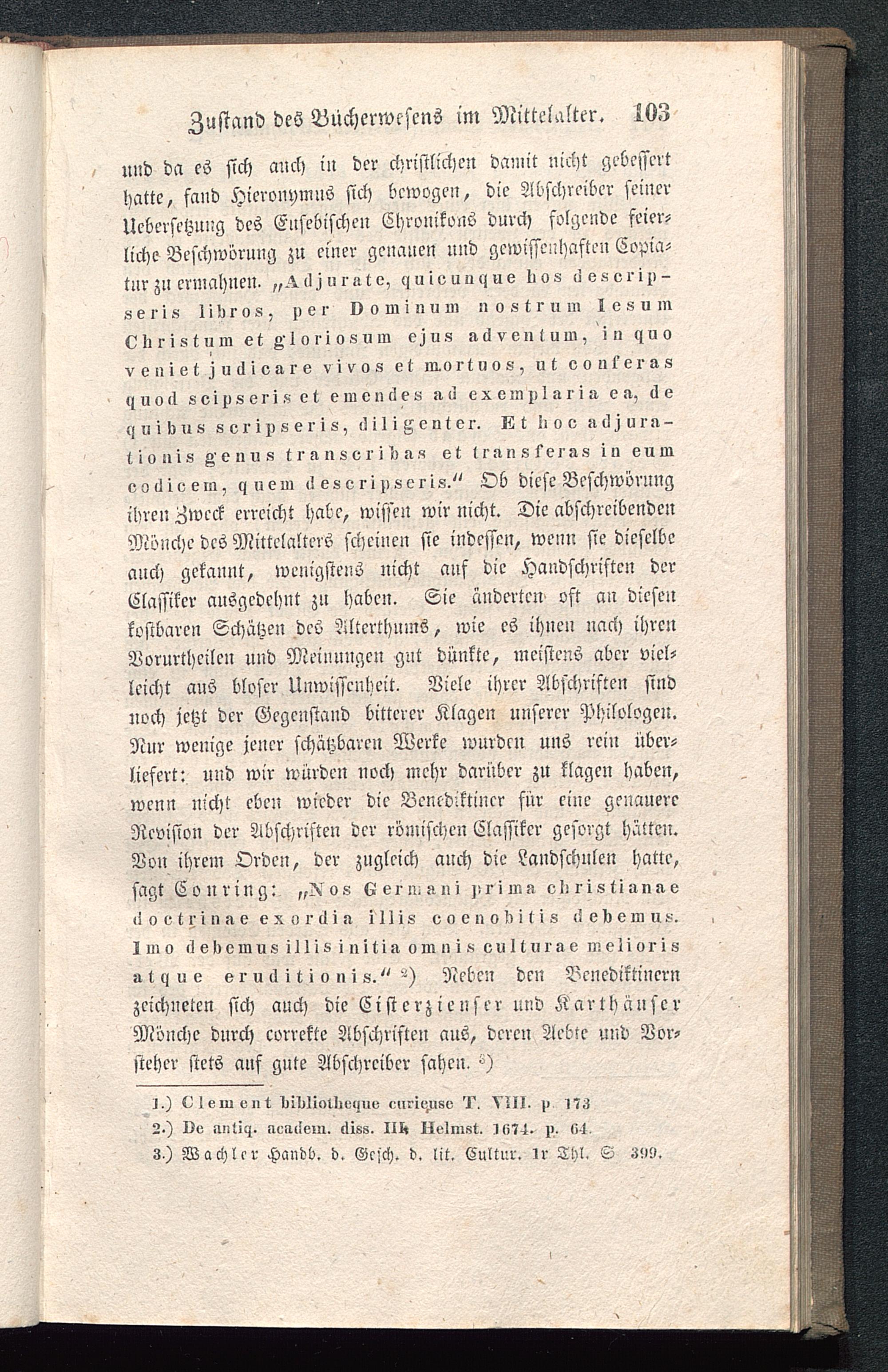 und da es sich mich in der christlichen damit nicht gebesserthatte, fand Hieronpmns sich bewogen, die Abschreiber seinerUebcrsetznng des Ensebischen Chronikons durch folgende feier-liche Beschwörung zu einer genauen und gewissenhaften Copia-tnr zu ermähnen, „.^«I^urate, quivunque t><>« iZiz«vrio-LeIi« IiI, ro 8 , per vominuIN II o 8 t r II IN I o 8 II INOliristuin et gloriosmn e^jus aävenlum, in quoveiiiet^ucliviire vivo 8 et m.c> rt u o 8 , ut v o nteia squoil 8viv8eri8et ewvncie« iiit exeinnlaii» e », äeqiiibii« 8vrip8eri8, nili^eoter. IZt Iioe üüjurn-tiouis genii8 t r a n 8 v r i l> » 8 et lr.in s fers-z in eiimvo itio em, q iiein ^ eso ri nseris." Ob diese Bes6)wörnngihren Zweck erreicht habe, wissen wir nicht. Die abschreibendenMönche des Mittelalters scheinen sie indessen, wenn sie dieselbeauch gekannt, wenigstens nicht auf die Handschristen derKlassiker ausgedehnt zu habcu. Sie änderten oft an diesenkostbaren Schätzen des Alterthums, wie es ihnen nach ihrenVorurthcilen und Meinungen gut dünkte, meistens aber viel-leicht aus bloser Unwissenheit. Viele ihrer Abschriften sindnoch jetzt der Gegenstand bitterer Klagen unserer Philologen.Nur wenige jener schätzbaren Werke wurden uns rein über-liefert: und wir würden noch mehr darüber zu klagen haben,wenn nicht eben wieder die Benediktiner für eine genauereRevision der Abschriften der römischen Classikcr gesorgt hätten.Von ihrem Orden, der zugleich auch die Landschnlen hatte,sagt Conring: „Xc>8 Kermsni prima vli rist!»niie,1 o v t r i n >i e e x u i it i » illis voenoditis c?edeinu8.I »> o >t ebemii8 illis i niti» omni 8 vuItiirae melioris» tu. ue e r u <I i t i v n i s." ^) Neben den Benediktinernzeichneten sich auch die Cisterzienser und KarthänsevMönche durch corrckte Abschriften aus, deren Aebte und Vor-steher stets auf gute Abschreiber sahen.