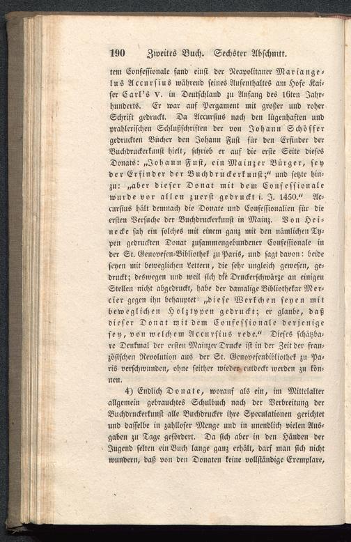 tcm Confessionale fand einst der Neapolitaner Mariange-lus Accursius während seines Aufenthaltes am Hofe Kai-ser Carl's V. in Deutschland zu Anfang des löten Jahr-hunderts. Er war auf Pergament mit großer und roherSchrift gedruckt. Da Accursius nach den lügenhaften undprahlerischen Schlußschristen der von Johann Schöffergedruckten Bücher den Johann Fnst für den Erfinder derBuchdruckcrkunst hielt, schrieb er auf die erste Seite diesesDonats: „Johann Fnst, ein Mainzer Bürger, seyder Erfinder der Buchdruckerkunst;" und setzte hin-zu: „aber dieser Donat mit dem Confessionalewurde vor allen zuerst gedruckt i. I. 1450." Ac-cursius hält demnach die Donate und Confefsionalien für dieersten Versuche der Buchdruckerkunst in Mainz . Von Hei-necke sah ein solches mit einem ganz mit den nämlichen Ty-pen gedruckten Donat zusammengebundener Confessionale inder St. Genovefcn-Bibliothek zu Paris , und sagt davon: beideseyen mit beweglichen Lettern, die sehr ungleich gewesen, ge-druckt; deswegen und weil sich die Druckerschwärze an einigenStellen nicht abgedruckt, habe der damalige Bibliothekar M er-cier gegen ihn behauptet- „diese Wcrkchen seyen mitbeweglichen Holztypen gedruckt; er glanbe, daßdieser Donat mit dem Confessionale derjenigesey, von welchem Accursius rede." Dieses schätzba-re Denkmal der ersten Mainzer Drucke ist in der Zeit der fran-zösischen Revolution aus der St. Gcnovefenbibliothek zu Pa-ris verschwunden, ohne seither wieder entdeckt werden zu kön-nen.