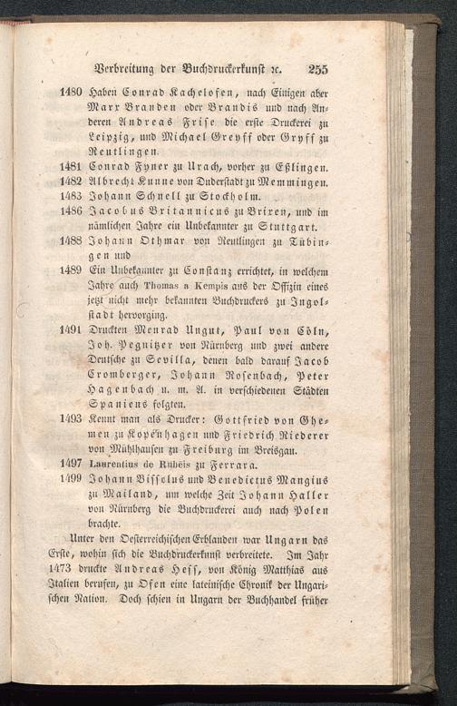 Unter den Oesterreichischen Erblanden war Ungarn dasErste, wohin sich die Bnchdruckerknnst verbreitete. Im Jahr1473 druckte Andreas Hess , von König Matthias ausItalien berufen, zu Ofen eine lateinische Chronik der Ungari-schen Nation. Doch schien in Ungarn der Buchhandel früher