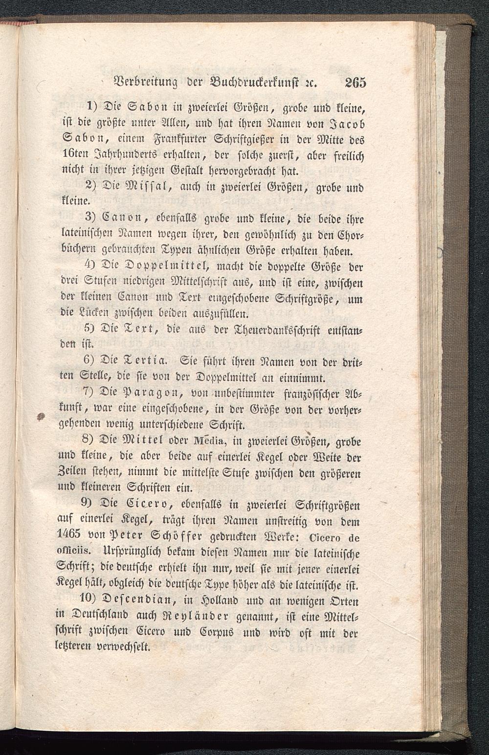 9) Die Cic,ero, ebenfalls in zweierlei Schriftgrößenauf einerlei Kegel, trägt ihren Namen unstreitig von dem1465 von Peter Schöffer gedruckten Werke: oioern <ZenMoii«. Ursprünglich bekam diesen Namen nur die lateinischeSchrift; die deutsche erhielt ihn nnr, weil sie mit jener einerleiKegel hält, obgleich die deutsche Type höher als die lateinische ist.