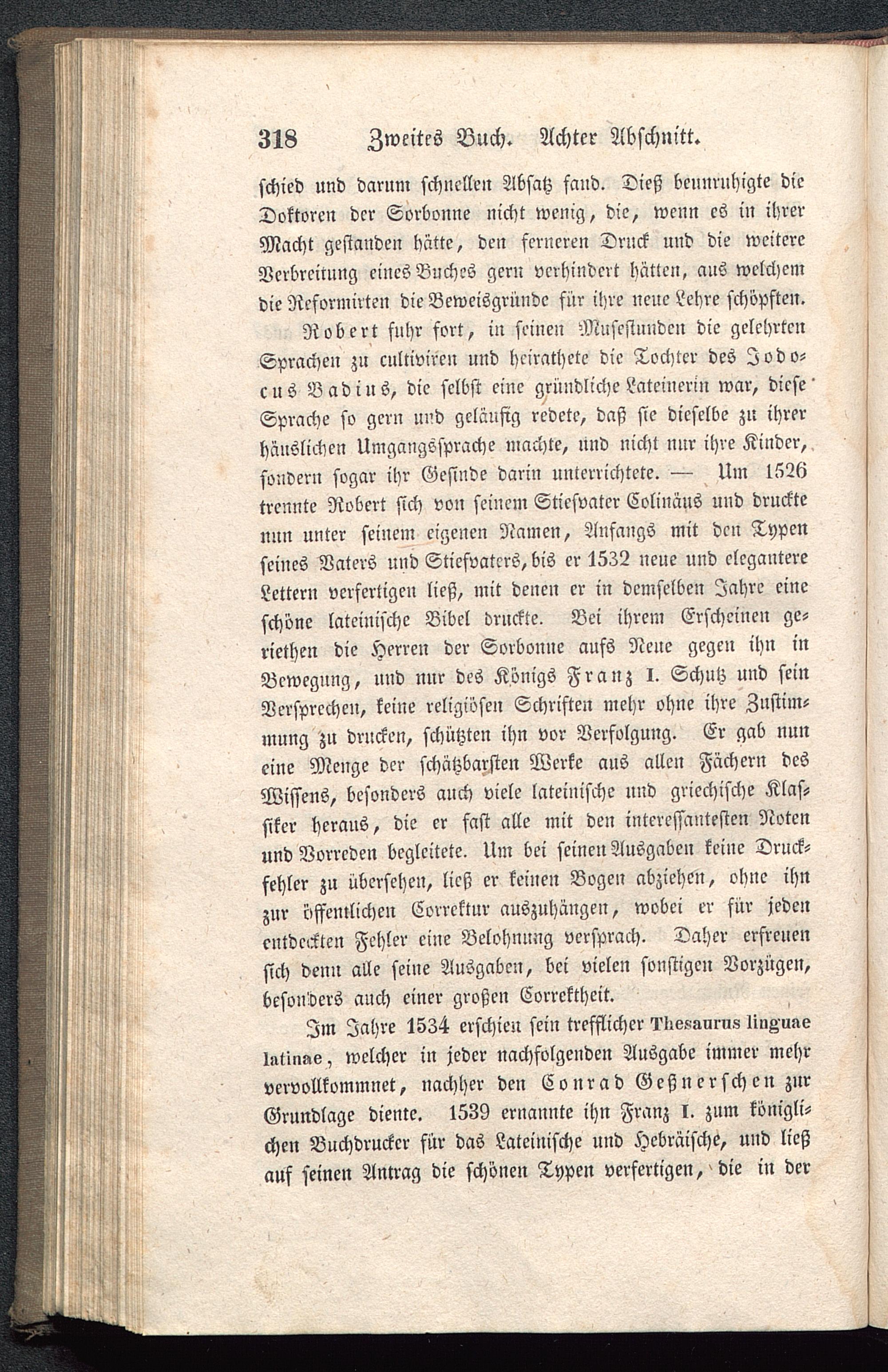 Im Jahre 1534 erschien sein trefflicher 1'Iiek-surus linAiiae1»tin-»e, welcher in jeder nachfolgenden Ausgabe immer mehrvervollkommnet, nachher den Cour ad Geßu er scheu zurGrundlage diente. 1539 ernannte ihn Franz I. zum königli-chen Buchdrucker für das Lateinische und Hebräische, und ließauf seinen Antrag die schönen Typen verfertigen,' die in der