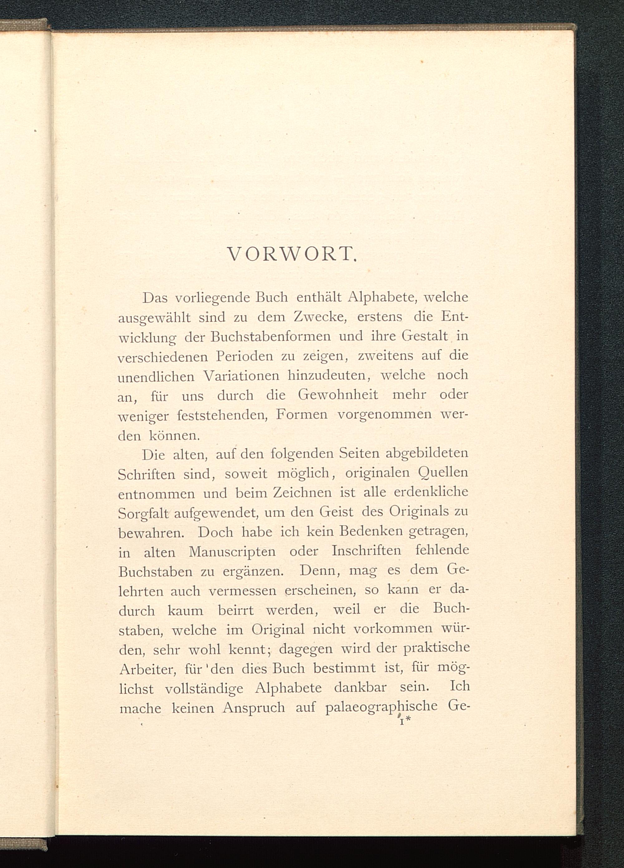 Die alten, auf den folgenden Seiten abgebildetenSchriften sind, soweit möglich, originalen Quellenentnommen und beim Zeichnen ist alle erdenklicheSorgfalt aufgewendet, um den Geist des Originals zubewahren. Doch habe ich kein Bedenken getragen,in alten Manuscripten oder Inschriften fehlendeBuchstaben zu ergänzen. Denn, mag es dem Ge-lehrten auch vermessen erscheinen, so kann er da¬durch kaum werden, weil er die Buch¬staben, welche im Original nicht vorkommen wür-den, sehr wohl kennt; dagegen wird der praktischeArbeiter, für'den dies Buch bestimmt ist, für mög-lichst vollständige Alphabete dankbar sein. Ichmache keinen Anspruch auf palaeographische Ge-