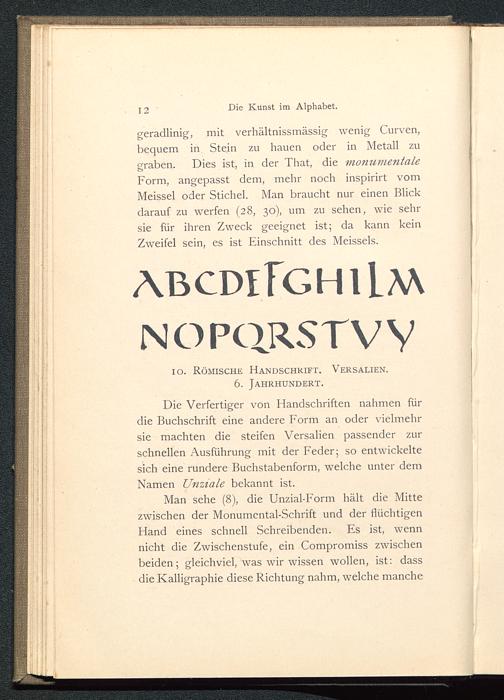 Die Verfertiger von Handschristen nahmen fürdie Buchschrift eine andere Form an oder vielmehrsie machten die steifen Versalien passender zurschnellen Ausführung mit der Feder; so entwickeltesich eine rundere Buchstabenform, welche unter demNamen Unztale bekannt ist.