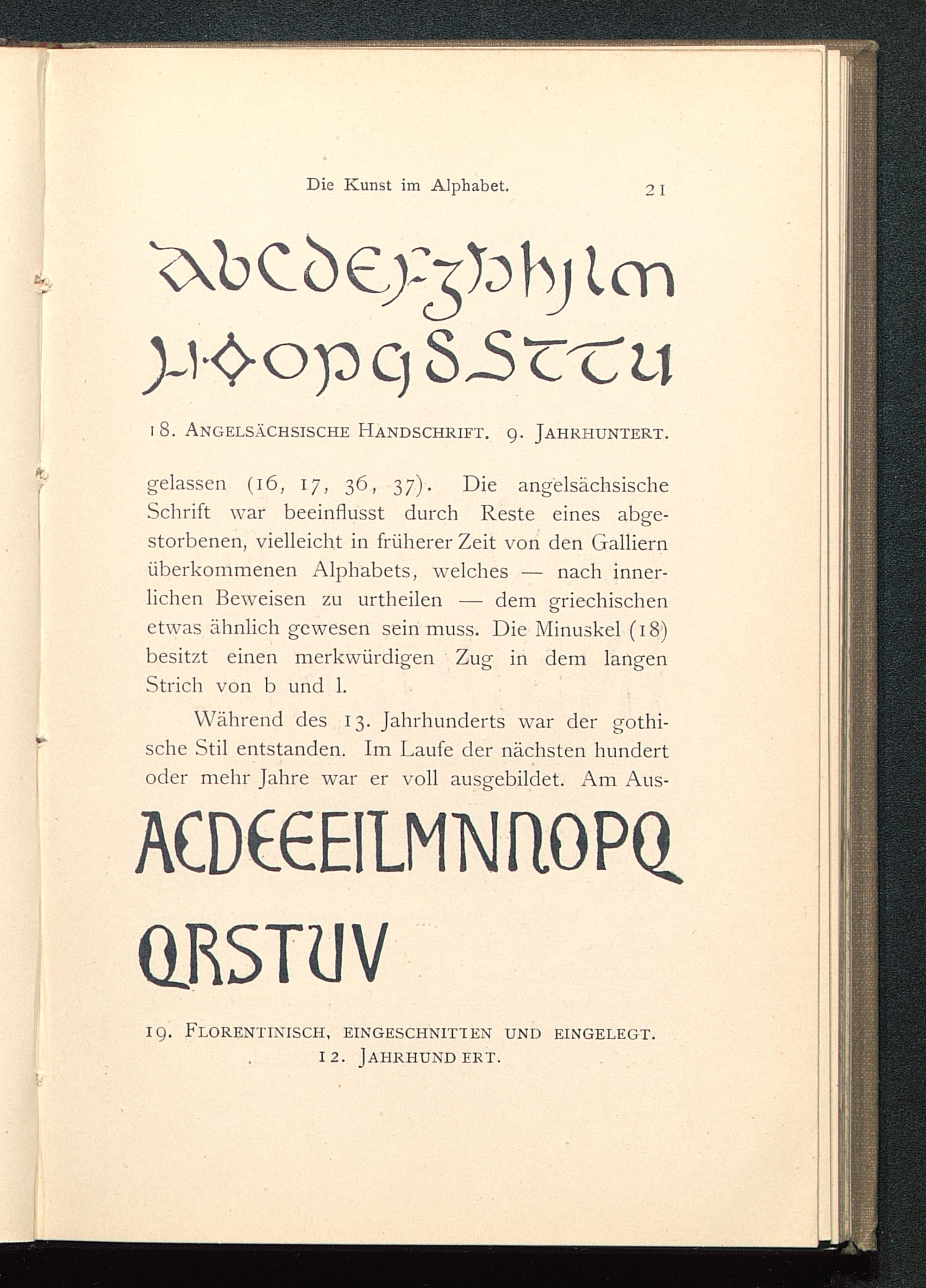 gelassen (16, 17, 36, 37). Die angelsächsischeSchrift war beeinflusst durch Reste eines abge-storbenen, vielleicht in früherer Zeit von den Galliernüberkommenen Alphabets, welches — nach inner-liehen Beweisen zu urtheilen — dem griechischenetwas ähnlich gewesen sein muss. Die Minuskel (18)besitzt einen merkwürdigen Zug in dem langenStrich von b und 1.