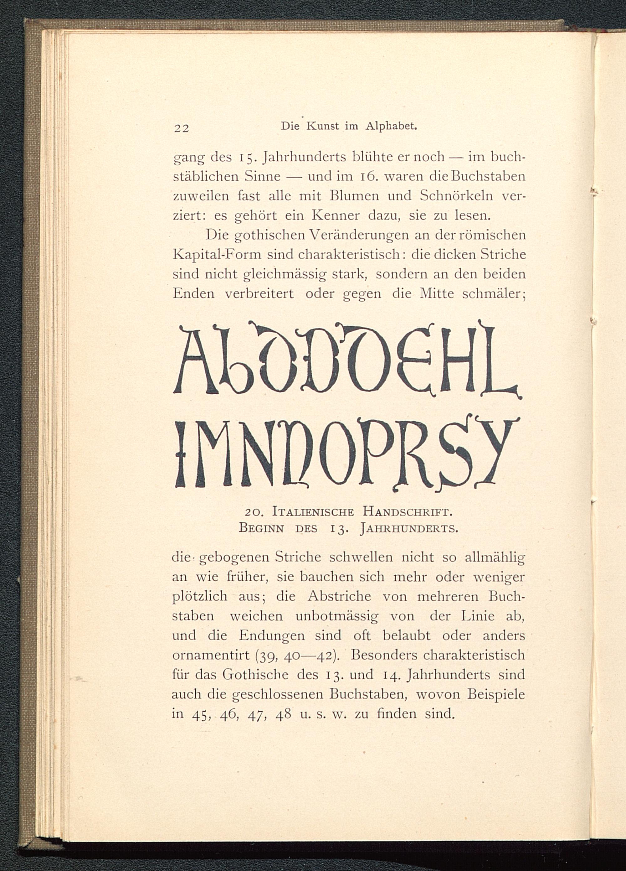 die■ gebogenen Striche schwellen nicht so allmähligan wie früher, sie bauchen sich mehr oder wenigerplötzlich aus; die Abstriche von mehreren Buch-Stäben weichen unbotmässig von der Linie ab,und die Endungen sind oft belaubt oder andersornamentirt (39, 40—42). Besonders charakteristischfür das Gothische des 13. und 14. Jahrhunderts sindauch die geschlossenen Buchstaben, wovon Beispielein 45, 46, 47, 48 u. s. w. zu finden sind.