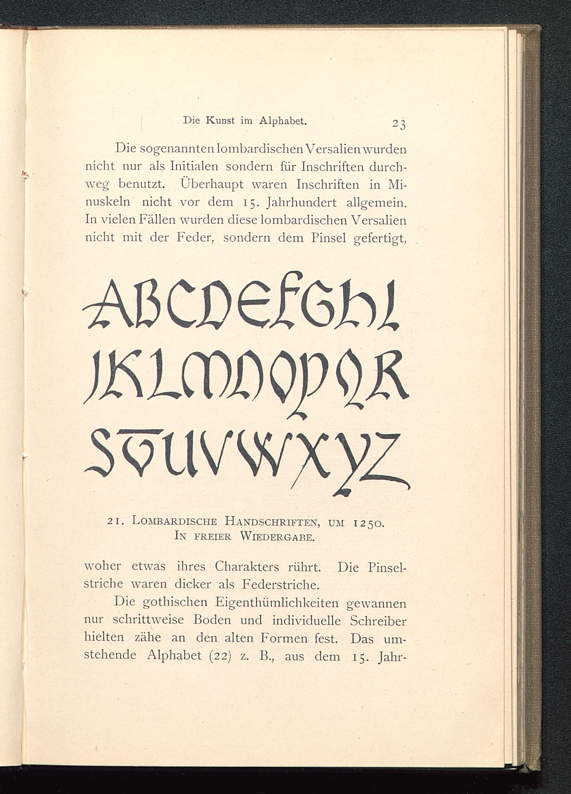 Die gothischen Eigenthümlichkeiten gewannennur schrittweise Boden und individuelle Schreiberhielten zähe an den alten Formen fest. Das um-stehende Alphabet (22) ζ. B., aus dem 15. Jahr-