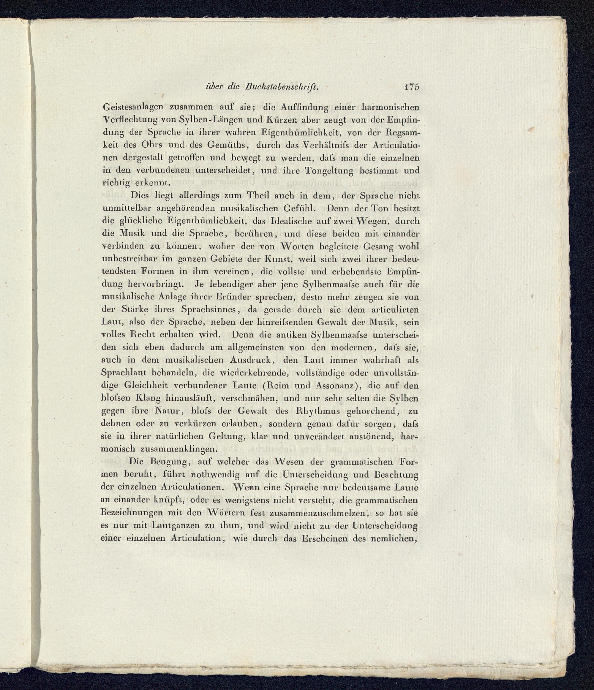 Geistesanlagen zusammen auf sie; die Auffindung einer harmonischenVerflechtung von Sylben-Längen und Kürzen aber zeugt von der Empfin-dung der Sprache in ihrer wahren Eigentümlichkeit, von der Regsam-keit des Ohrs und des Gemülhs, durch das Verhällnifs der Articulatio-nen dergestalt getroffen und bevvegt zu werden, dafs man die einzelnenin den verbundenen unterscheidet, und ihre Tongeltung bestimmt undrichtig erkennt.