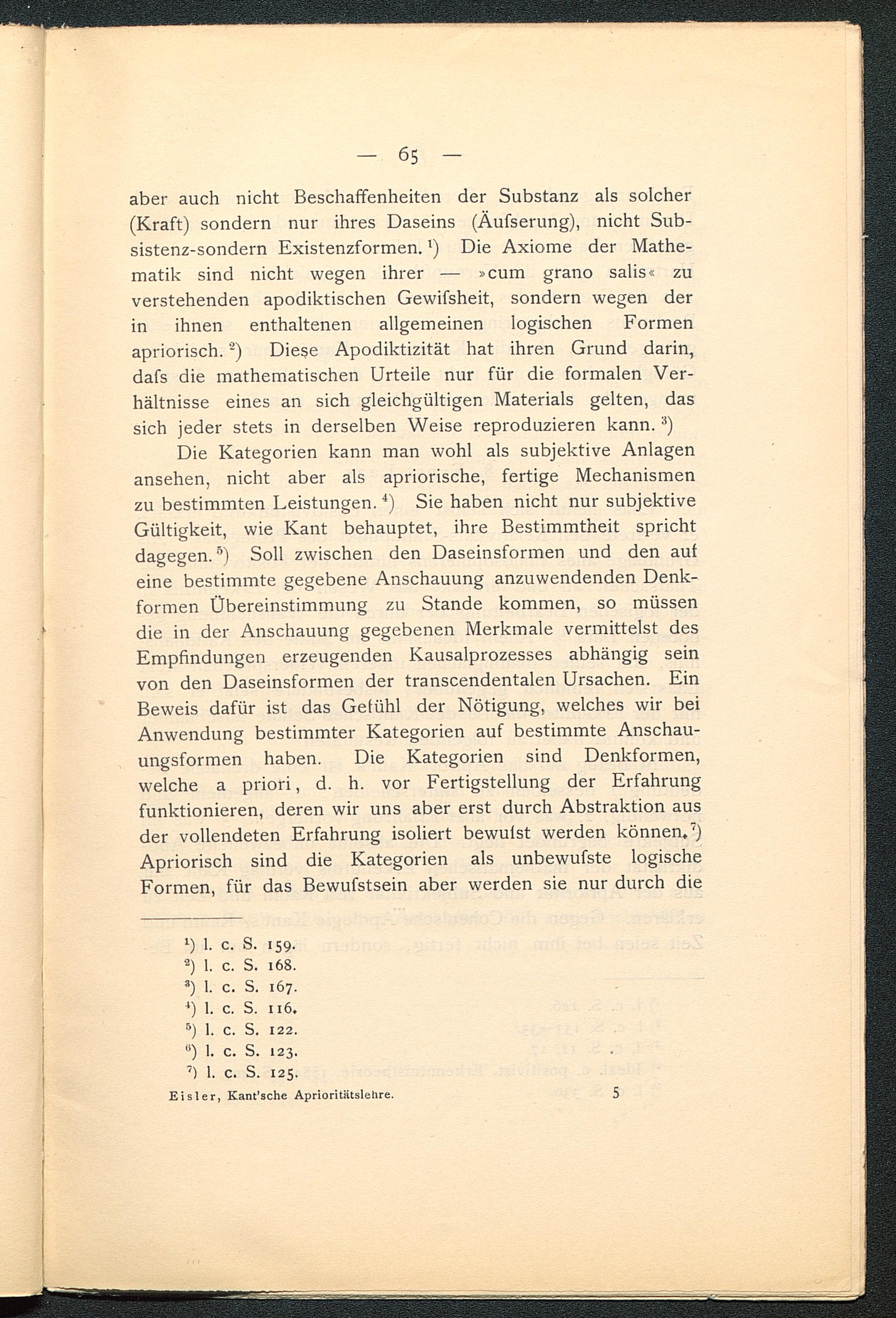 aber auch nicht Beschaffenheiten der Substanz als solcher(Kraft) sondern nur ihres Daseins (Äufserung), nicht Sub-sistenz-sondern Existenzformen. l ) Die Axiome der Mathe-matik sind nicht wegen ihrer — »cum grano salis« zuverstehenden apodiktischen Gewifsheit, sondern wegen derin ihnen enthaltenen allgemeinen logischen Formenapriorisch. -) Diese Apodiktizität hat ihren Grund darin,dafs die mathematischen Urteile nur für die formalen Ver-hältnisse eines an sich gleichgültigen Materials gelten, dassich jeder stets in derselben Weise reproduzieren kann. ;i )