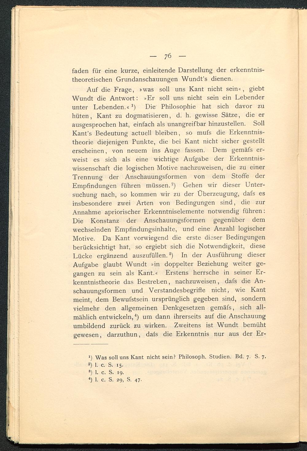 Auf die Frage, »was soll uns Kant nicht sein«, giebtWundt die Antwort: »Er soll uns nicht sein ein Lebenderunter Lebenden.« 1 ) Die Philosophie hat sich davor zuhüten, Kant zu dogmatisieren, d. h. gewisse Sätze, die erausgesprochen hat, einfach als unangreifbar hinzustellen. SollKant's Bedeutung actuell bleiben, so mufs die Erkenntnis-theorie diejenigen Punkte, die bei Kant nicht sicher gestellterscheinen, von neuem ins Auge fassen. Dem gemäfs er-weist es sich als eine wichtige Aufgabe der Erkenntnis-wissenschaft die logischen Motive nachzuweisen, die zu einerTrennung der Anschauungsformen von dem Stoffe derEmpfindungen führen müssen. 2 ) Gehen wir dieser Unter-suchung nach, so kommen wir zu der Überzeugung, dafs esinsbesondere zwei Arten von Bedingungen sind, die zurAnnahme apriorischer Erkenntniselemente notwendig führen:Die Konstanz der Anschauungsformen gegenüber demwechselnden Empfindungsinhalte, und eine Anzahl logischerMotive. Da Kant vorwiegend die erste dieser Bedingungenberücksichtigt hat, so ergiebt sich die Notwendigkeit, dieseLücke ergänzend auszufüllen. 3 ) In der Ausführung dieserAufgabe glaubt Wundt »in doppelter Beziehung weiter ge-gangen zu sein als Kant.« Erstens herrsche in seiner Er-kenntnistheorie das Bestreben, nachzuweisen, dafs die An-schauungsformen und Verstandesbegriffe nicht, wie Kant meint, dem Bewufstsein ursprünglich gegeben sind, sondernvielmehr den allgemeinen Denkgesetzen gemäfs, sich all-mählich entwickeln, *) um dann ihrerseits auf die Anschauungumbildend zurück zu wirken. Zweitens ist Wundt bemühtgewesen, darzuthun, dais die Erkenntnis nur aus der Er-