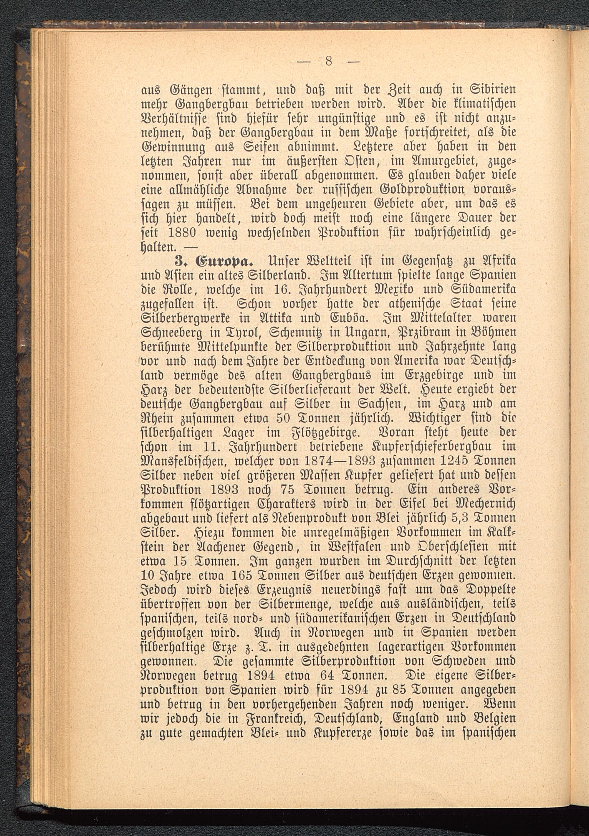 3. Europa. Unser Weltteil ist im Gegensatz zu Afrika und Asien ein altes Silberland. Im Altertum spielte lange Spanien die Rolle, welche im 16. Jahrhundert Mexiko und Südamerika zugefallen ist. Schon vorher hatte der athenische Staat seineSilberbergwerke in Attika und Euboa . Im Mittelalter warenSchneeberg in Tyrol, Schemnitz in Ungarn. Przibram in Böhmen berühmte Mittelpunkte der Silberproduktion und Jahrzehnte langvor und nach dem Jahre der Entdeckung von Amerika war Deutsch-land vermöge des alten Gangbergbaus im Erzgebirge und imHarz der bedeutendste Silberlieferant der Welt. Heute ergiebt derdeutsche Gangbergbau auf Silber in Sachsen, im Harz und amRhein zusammen etwa 50 Tonnen jährlich. Wichtiger sind diesilberhaltigen Lager im Flötzgebirge. Voran steht heute derschon im 11. Jahrhundert betriebene Kupferschieferbergbau imMansfeldischen, welcher von 1874—1893 zusammen 1245 TonnenSilber neben viel größeren Massen Kupfer geliefert hat und dessenProduktion 1893 noch 75 Tonnen betrug. Ein anderes Vor-kommen flötzartigen Charakters wird in der Eifel bei Mechernich abgebaut und liefert als Nebenprodukt von Blei jährlich 5,3 TonnenSilber. Hiezu kommen die unregelmäßigen Vorkommen im Kalk-stein der Aachener Gegend, in Westfalen und Oberschlesien mitetwa 15 Tonnen. Im ganzen wurden im Durchschnitt der letzten10 Jahre etwa 165 Tonnen Silber aus deutschen Erzen gewonnen.Jedoch wird dieses Erzeugnis neuerdings fast um das DoppelteÜbertrossen von der Silbermenge, welche aus ausländischen, teilsspanischen, teils nord- und sttdamerikanischen Erzen in Deutschland geschmolzen wird. Auch in Norwegen und in Spanien werdensilberhaltige Erze z. T. in ausgedehnten lagerartigen Vorkommengewonnen. Die gesammte Silberproduktion von Schweden undNorwegen betrug 1894 etwa 64 Tonnen. Die eigene Silber-produktion von Spanien wird für 1894 zu 85 Tonnen angegebenund betrug in den vorhergehenden Jahren noch weniger. Wennwir jedoch die in Frankreich, Deutschland, England und Belgien zu gute gemachten Blei- und Kupfererze sowie das im spanischen