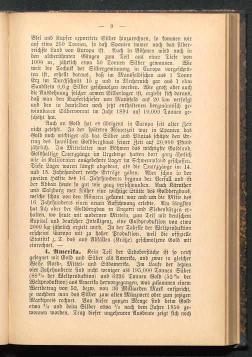 4. Amerika. Kein Teil der Erdoberfläche ist so reichgesegnet mit Gold und Silber als Amerika , und zwar in gleicherWeise Nord-, Mittel- und Südamerika . Im Laufe der letztenvier Jahrhunderte sind nicht weniger als 195,000 Tonnen Silber(88°/o der Weltproduktion) und 6236 Tonnen Gold (52 °/o derWeltproduktion) aus Amerika hervorgegangen, was zusammen einemWertbetrag von 52, bezw. von 36 Milliarden Mark entspricht,je nachdem man das Silber zum alten Münzwert oder zum jetzigenMarktpreis rechnet. Von dieser ganzen Menge sind beim Goldetwa 2/3 und beim Silber etwa '/2 nach dem Jahre 1850 ge-wonnen worden. Trotz dieser ungeheuren Ausbeute zeigt sich noch