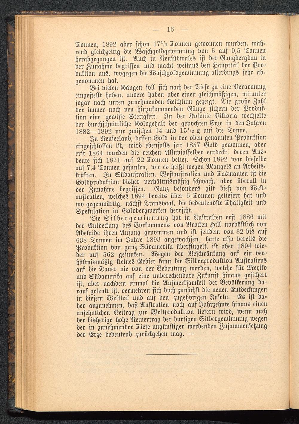Bei vielen Gängen soll sich nach der Tiefe zu eine Verarmungeingestellt haben, andere haben aber einen gleichmäßigen, mituntersogar nach unten zunehmenden Reichtum gezeigt. Die große Zahlder immer noch neu hinzukommenden Gänge sichern der Produk-tion eine gewisse Stetigkeit. In der Kolonie Viktoria wechselteder durchschnittliche Goldgehalt der gepochten Erze in den Jahren1882—1892 nur zwischen 14 und 15'/s A auf die Tonne.