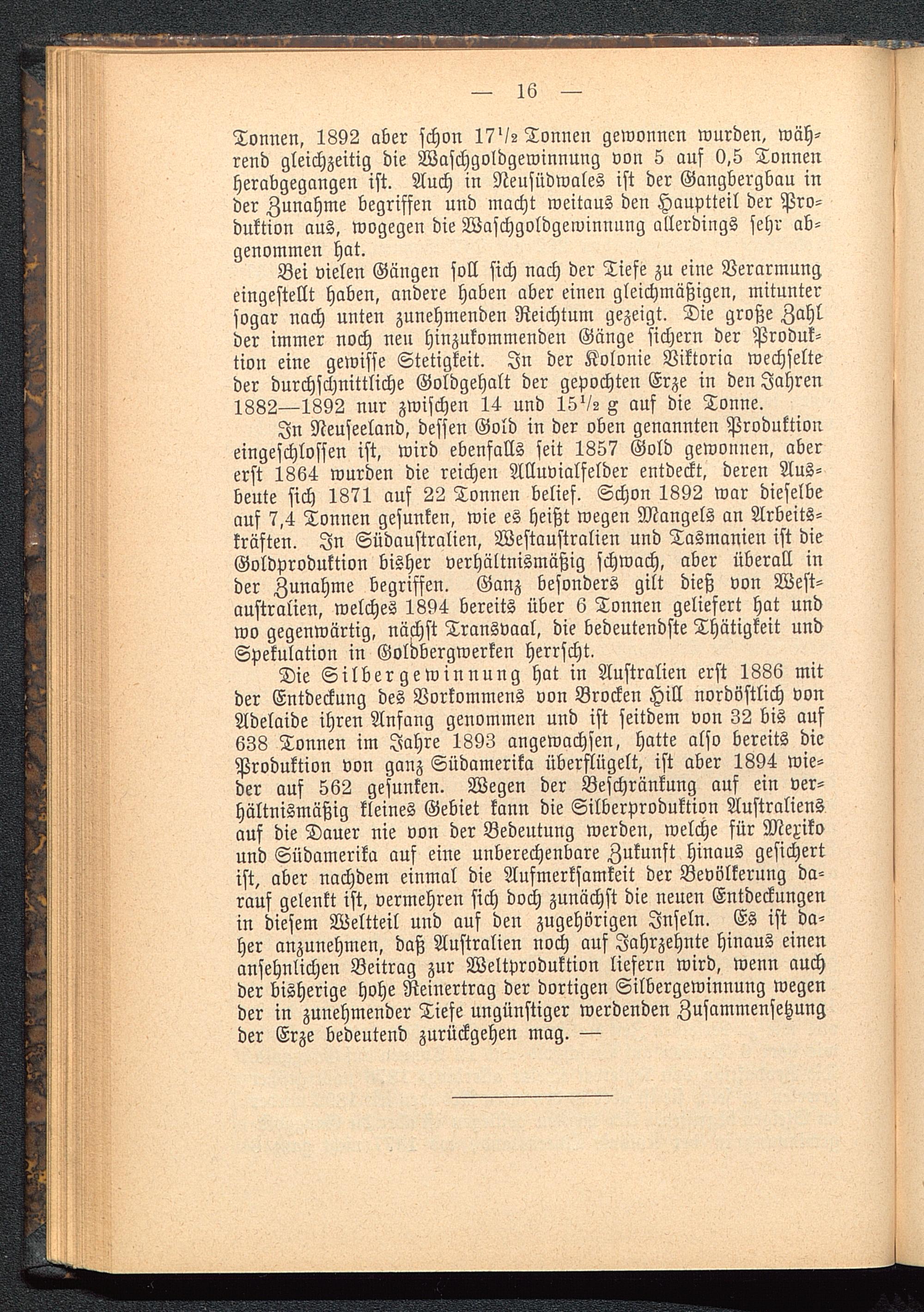 Die Silber gewinnung hat in Australien erst 1886 mitder Entdeckung des Vorkommens von Brocken Hill nordöstlich vonAdelaide ihren Anfang genommen und ist seitdem von 32 bis auf638 Tonnen im Jahre 1893 angewachsen, hatte also bereits dieProduktion von ganz Südamerika überflügelt, ist aber 1894 wie-der auf 562 gesunken. Wegen der Beschränkung auf ein ver-hältnismäßig kleines Gebiet kann die Silberproduktion Australiens auf die Dauer nie von der Bedeutung werden, welche für Mexiko und Südamerika auf eine unberechenbare Zukunft hinaus gesichertist, aber nachdem einmal die Aufmerksamkeit der Bevölkerung da-rauf gelenkt ist, vermehren sich doch zunächst die neuen Entdeckungenin diesem Weltteil und auf den zugehörigen Inseln. Es ist da-her anzunehmen, daß Australien noch auf Jahrzehnte hinaus einenansehnlichen Beitrag zur Weltproduktion liefern wird, wenn auchder bisherige hohe Reinertrag der dortigen Silbergewinnung wegender in zunehmender Tiefe ungünstiger werdenden Zusammensetzungder Erze bedeutend zurückgehen mag. —