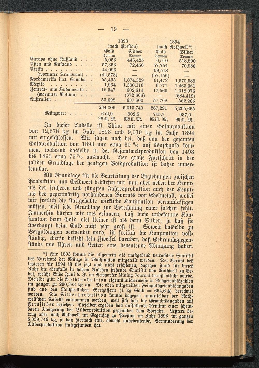 In dieser Tabelle ist China mit einer Goldproduktionvon 12,678 KZ im Jahr 1893 und 9,019 KZ im Jahr 1894mit eingeschlossen. Wir fügen noch bei, daß von der gesamtenGoldproduktion von 1893 nur etwa 30 °/o auf Waschgold kom-men, während dasselbe in der Gesamtweltproduktion von 1493bis 1893 etwa 75°/o ausmacht. Der große Fortschritt in dersoliden Grundlage der heutigen Goldproduktion ist daher unver-kennbar.