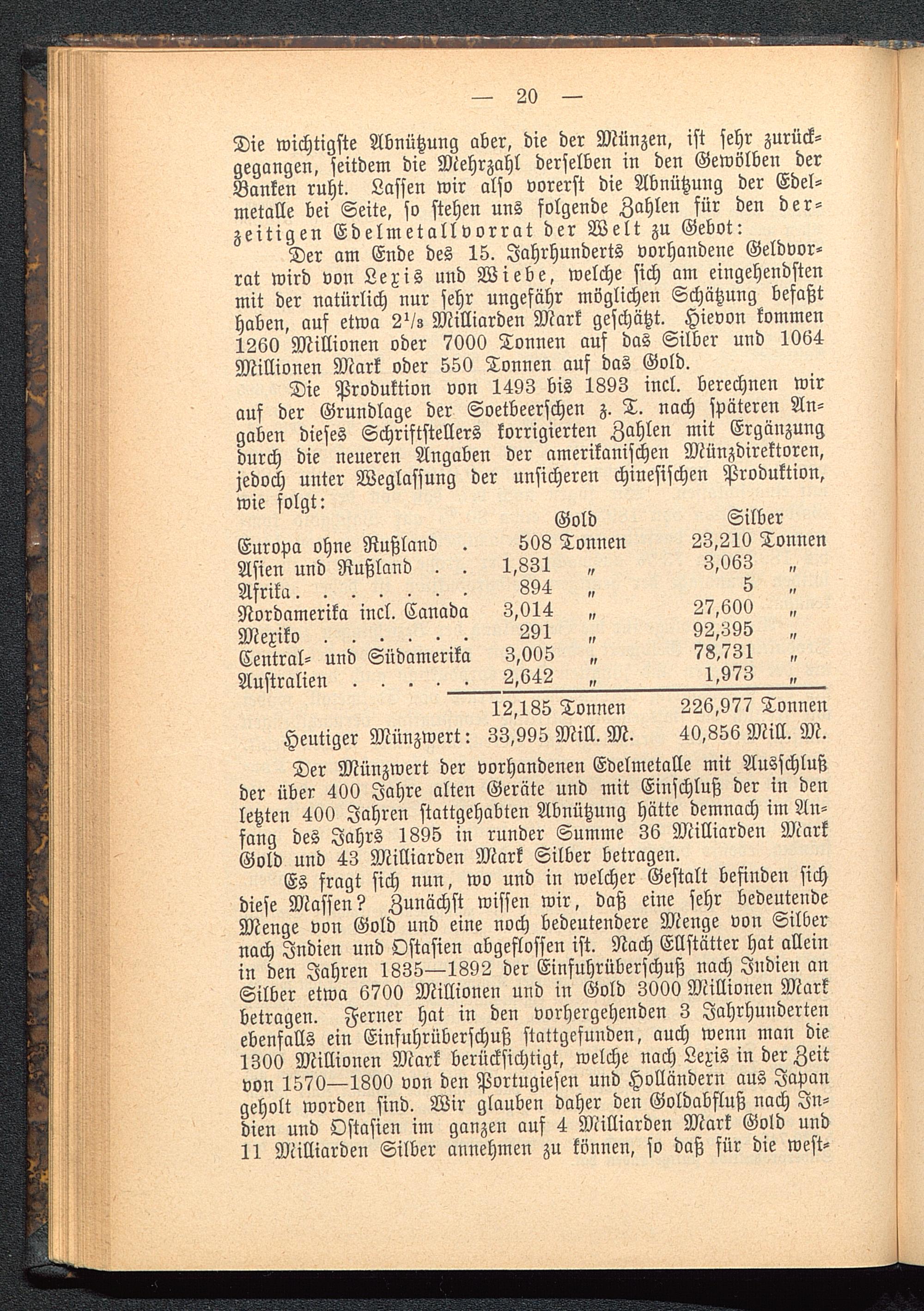 Der Münzwert der vorhandenen Edelmetalle mit Ausschlußder über 400 Jahre alten Geräte und mit Einschluß der in denletzten 400 Jahren stattgehabten Abnützung hätte demnach im An-fang des Jahrs 1895 in runder Summe 36 Milliarden MarkGold und 43 Milliarden Mark Silber betragen.