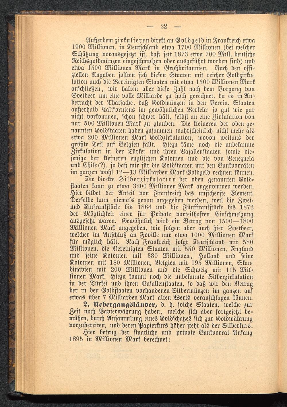 Die direkte Silberzirkulation der oben genannten Gold-staaten kann zu etwa 3200 Millionen Mark angenommen werden.Hier bildet der Anteil von Frankreich das unsicherste Element.Derselbe kann niemals genau angegeben werden, weil die Zwei-und Einfrankstücke bis 1864 und die Fünffrankstücke bis 1872der Möglichkeit einer für Private vorteilhaften Einschmelzungausgesetzt waren. Gewöhnlich wird ein Betrag von 1500—1800Millionen Mark angegeben, wir folgen aber auch hier Soetbeer,welcher im Anschluß an Foville nur etwa 1000 Millionen Markfür möglich hält. Nach Frankreich folgt Deutschland mit 580Millionen, die Vereinigten Staaten mit 550 Millionen, England und seine Kolonien mit 330 Millionen, Holland und seineKolonien mit 180 Millionen, Belgien mit 195 Millionen, Skan-dinavien mit 200 Millionen und die Schweiz mit 115 Mil-lionen Mark. Hiezu kommt noch die unbekannte Silberzirkulationin der Türkei und ihren Vasallenstaaten, so daß wir den Betragder in den Goldstaaten vorhandenen Silbermünzen im ganzen aufetwas über 7 Milliarden Mark alten Werts veranschlagen können.
