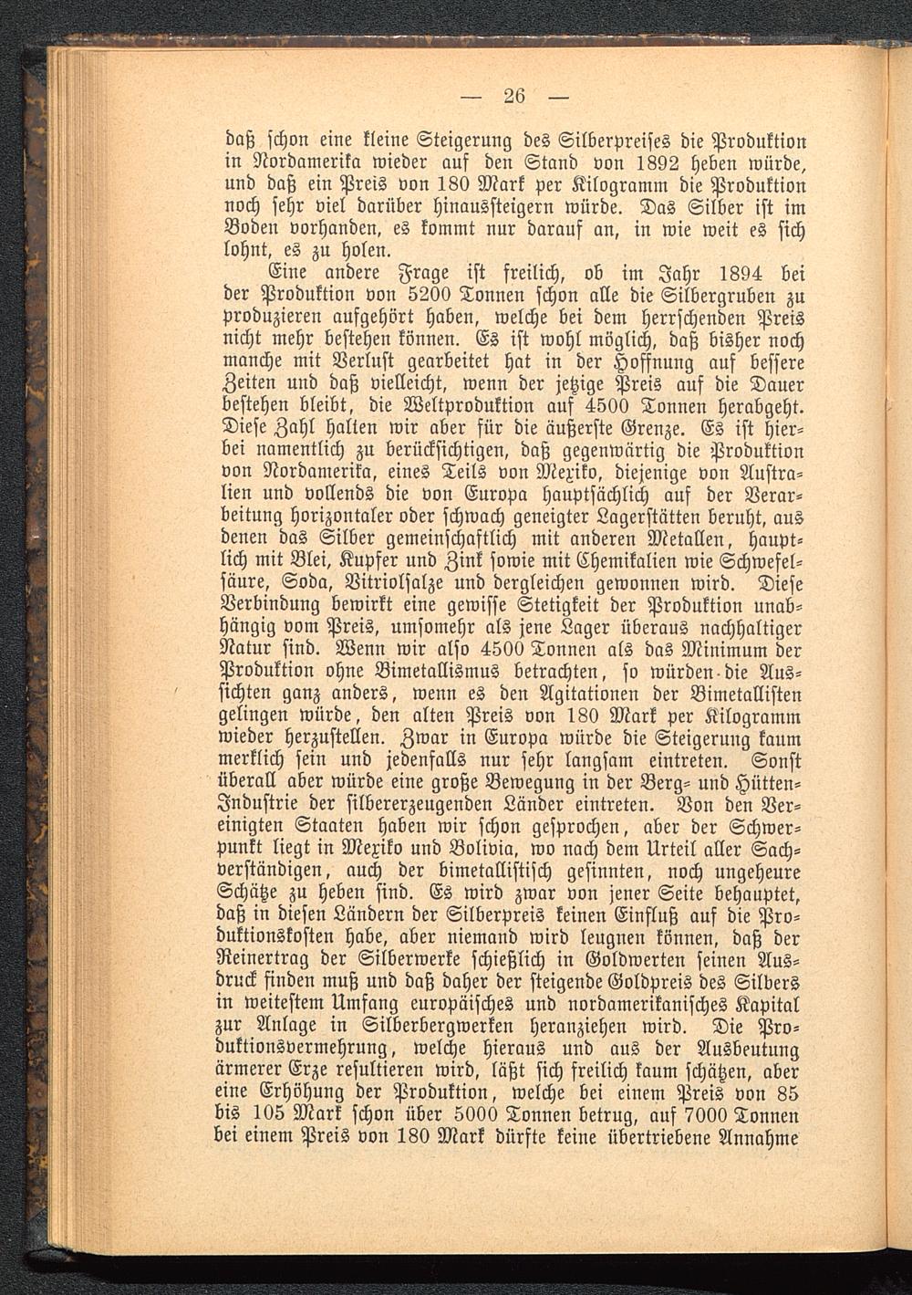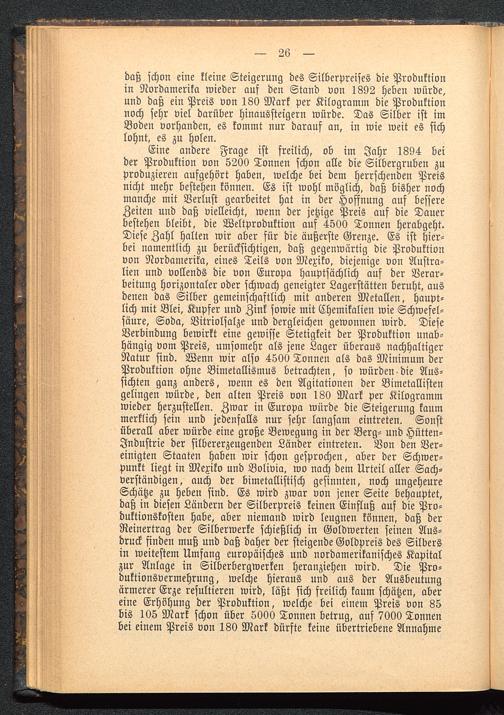 daß schon eine kleine Steigerung des Silberpreises die Produktionin Nordamerika wieder auf den Stand von 1392 heben würde,und daß ein Preis von 180 Mark per Kilogramm die Produktionnoch sehr viel darüber hinaussteigern würde. Das Silber ist imBoden vorhanden, es kommt nur darauf an, in wie weit es sichlohnt, es zu holen.