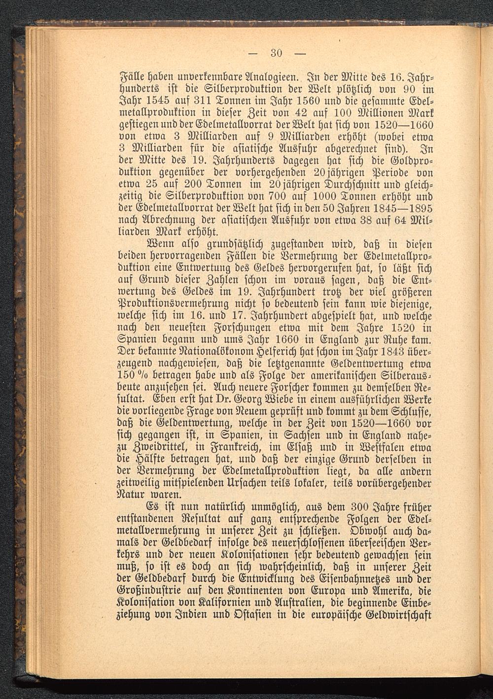 Wenn also grundsätzlich zugestanden wird, daß in diesenbeiden hervorragenden Fällen die Vermehrung der Edelmetallpro-duktion eine Entwertung des Geldes hervorgerufen hat, so läßt sichauf Grund dieser Zahlen schon im voraus sagen, daß die Ent-wertung des Geldes im 19. Jahrhundert trotz der viel größerenProduktionsvermehrung nicht so bedeutend sein kann wie diejenige,welche sich im 16. und 17. Jahrhundert abgespielt hat, und welchenach den neuesten Forschungen etwa mit dem Jahre 1520 inSpanien begann und ums Jahr 1660 in England zur Ruhe kam.Der bekannte Nationalökonom Helferich hat schon im Jahr 1843 über-zeugend nachgewiesen, daß die letztgenannte Geldentwertung etwa150 °/o betragen habe und als Folge der amerikanischen Silberaus-beute anzusehen sei. Auch neuere Forscher kommen zu demselben Re-sultat. Eben erst hat Dr. Georg Wiebe in einem ausführlichen Werkedie vorliegende Frage von Neuem geprüft und kommt zu dem Schlüsse,daß die Geldentwertung, welche in der Zeit von 1520—1660 vorsich gegangen ist, in Spanien, in Sachsen und in England nahe-zu Zweidrittel, in Frankreich, im Elsaß und in Westfalen etwadie Hälfte betragen hat, und daß der einzige Grund derselben inder Vermehrung der Edelmetallproduktion liegt, da alle andernzeitweilig mitspielenden Ursachen teils lokaler, teils vorübergehenderNatur waren.