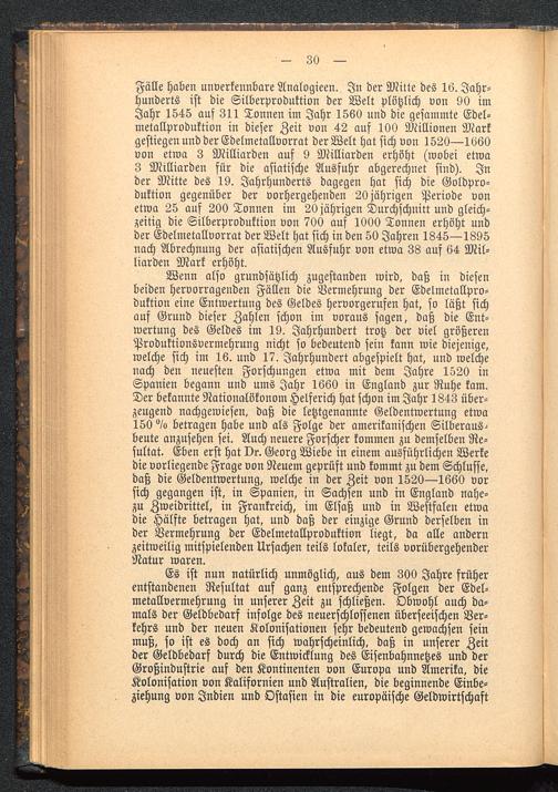 Fälle haben unverkennbare Analogieen. In der Mitte des 16. Jahr-hunderts ist die Silberproduktion der Welt plötzlich von 90 imJahr 1545 auf 311 Tonnen im Jahr 1560 und die gesammte Edel-metallproduktion in dieser Zeit von 42 auf 100 Millionen Markgestiegen und der Edelmetallvorrat der Welt hat sich von 1520—1060von etwa 3 Milliarden auf 9 Milliarden erhöht (wobei etwa3 Milliarden für die asiatische Ausfuhr abgerechnet sind). Inder Mitte des 19. Jahrhunderts dagegen hat sich die Goldpro-duktion gegenüber der vorhergehenden 20 jährigen Periode vonetwa 25 auf 200 Tonnen im 20 jährigen Durchschnitt und gleich-zeitig die Silberproduktion von 700 auf 1000 Tonnen erhöht undder Edelmetallvorrat der Welt hat sich in den 50 Jahren 1845—1895nach Abrechnung der asiatischen Ausfuhr von etwa 38 auf 64 Mil-liarden Mark erhöht.