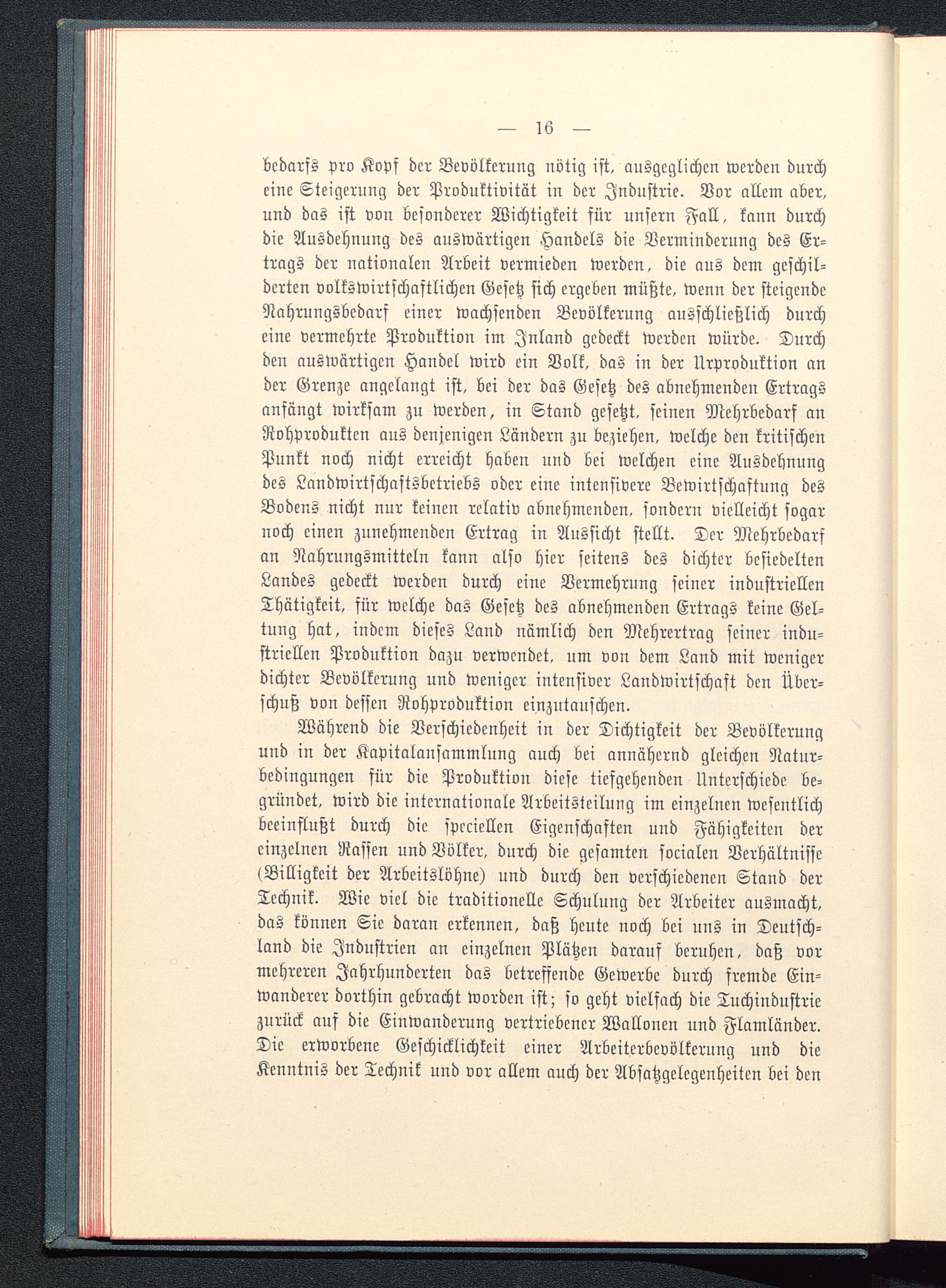 Während die Verschiedenheit in der Dichtigkeit der Bevölkerungund in der Kapitalansammlung auch bei annähernd gleichen Natur-bedingungen sür die Produktion diese tiefgehenden Unterschiede be-gründet, wird die internationale Arbeitsteilung im einzelnen wesentlichbeeinflußt durch die speciellen Eigenschaften und Fähigkeiten dereinzelnen Raffen und Völker, durch die gesamten socialen Verhältnisse«Billigkeit der Arbeitslöhne) uud durch den verschiedenen Stand derTechnik. Wie viel die traditionelle Schulung der Arbeiter ausmacht,das können Sie daran erkennen, daß heute noch bei uns in Deutsch-land die Industrien an einzelnen Plätzen daraus beruhen, daß vormehreren Jahrhunderten das betreffende Gewerbe durch fremde Ein-wanderer dorthin gebracht worden ist; so geht vielfach die Tuchindustriezurück auf die Einwanderung vertriebener Wallonen und Flamländer.Die erworbene Geschicklichkeit einer Arbeitcrbevölkerung und dieKenntnis der Technik und vor allem auch der Absatzgclegenheiten bei den