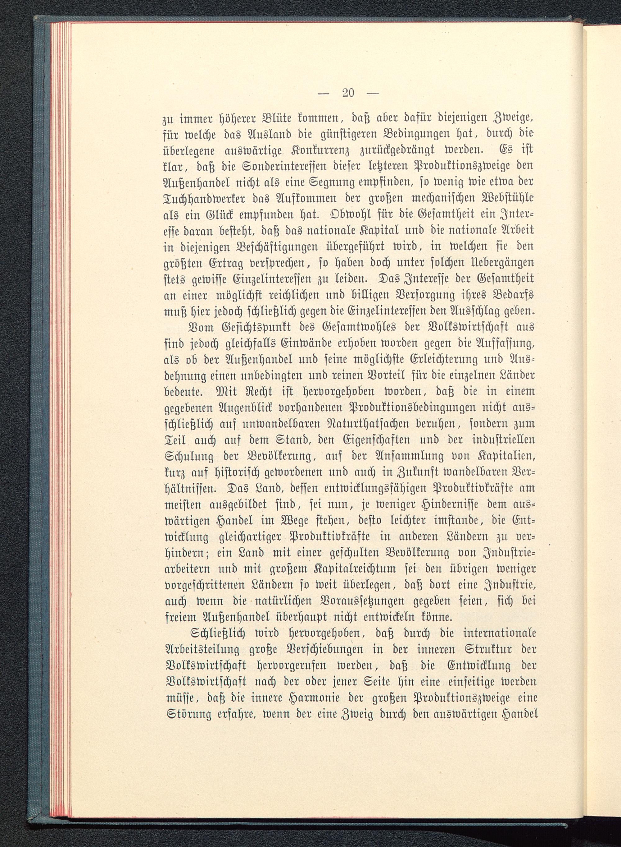 Schließlich wird hervorgehoben, daß durch die internationaleArbeitsteilung große Verschiebungen in der inneren Struktur derVolkswirtschaft hervorgerufen werden, daß die Entwicklung derVolkswirtschaft nach der oder jener Seite hin eine einseitige werdenmüsse, daß die innere Harmonie der großen Produktionszweige eineStörung erfahre, wenn der eine Zweig durch den auswärtigen Handel