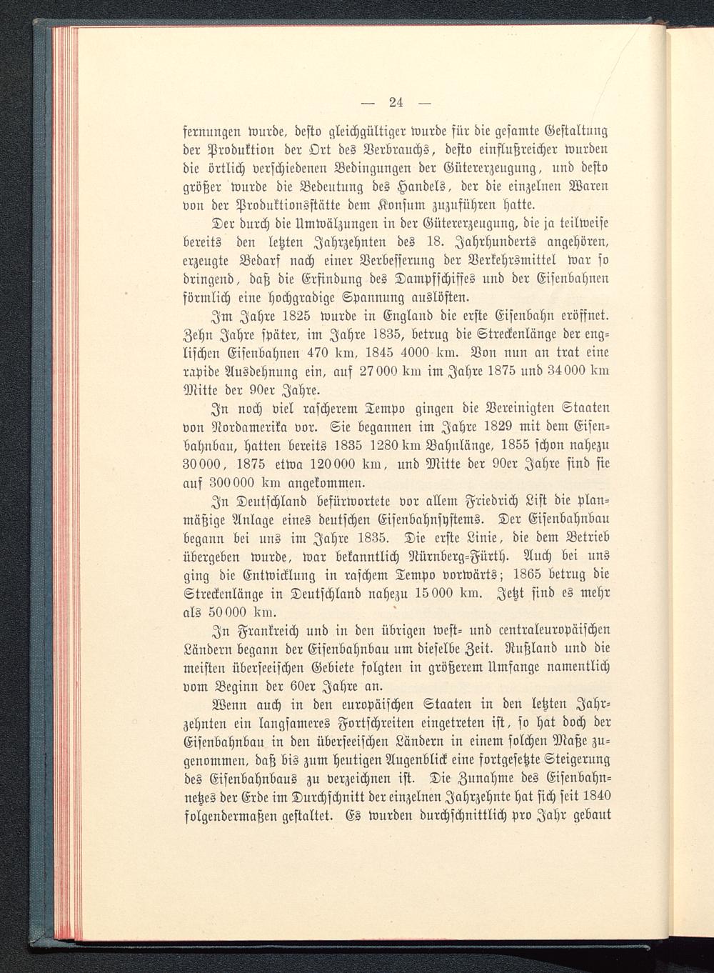 In Deutschland befürwortete vor allem Friedrich List die plan-mäßige Anlage eines deutschen Eisenbahnsystems. Der Eisenbahnbaubegann bei uus im Jahre 1835. Die erste Linie, die dem Betriebübergeben wurde, war bekanntlich Nürnberg -Fürth. Auch bei unsging die Entwicklung in raschem Tempo vorwärts; 1865 betrug dieStreckenlänge in Deutschland nahezu 15 000 km. Jetzt sind es mehrals 50000 km.