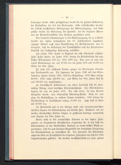 Im Jahre 1825 wurde in England die erste Eisenbahn eröffnet.Zehn Jahre später, im Jahre 1835, betrug die Streckenlänge der eng-lischen Eisenbahnen 470 km, 1845 4000 km. Von nun an trat einerapide Ausdehnung ein, auf 27000 km im Jahre 1875 und 34000 kmMitte der Wer Jahre.
