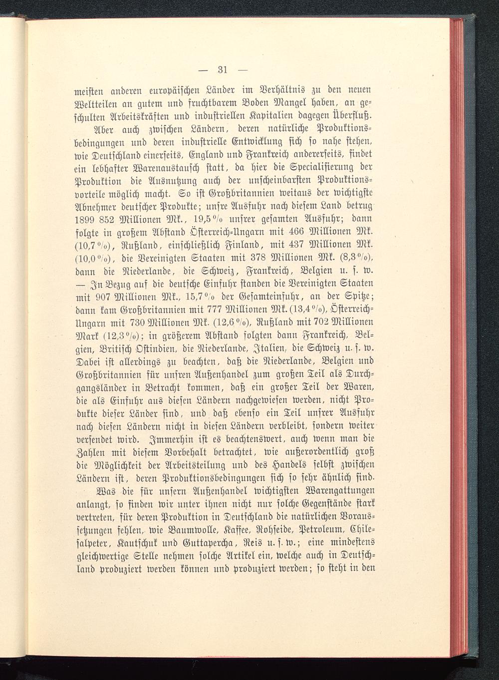 Was die für unsern Außenhandel wichtigsten Warengattungenanlangt, so finden wir unter ihnen nicht nur solche Gegenstände starkvertreten, für deren Produktion in Deutschland die natürlichen Voraus-setzungen fehlen, wie Baumwolle, Kaffee, Rohseide, Petroleum, Chile-salpeter, Kautschuk und Guttapercha, Reis u. s-w.; eine mindestensgleichwertige Stelle nehmen solche Artikel ein, welche auch in Deutsch-land produziert werden können und produziert werden; so steht in den