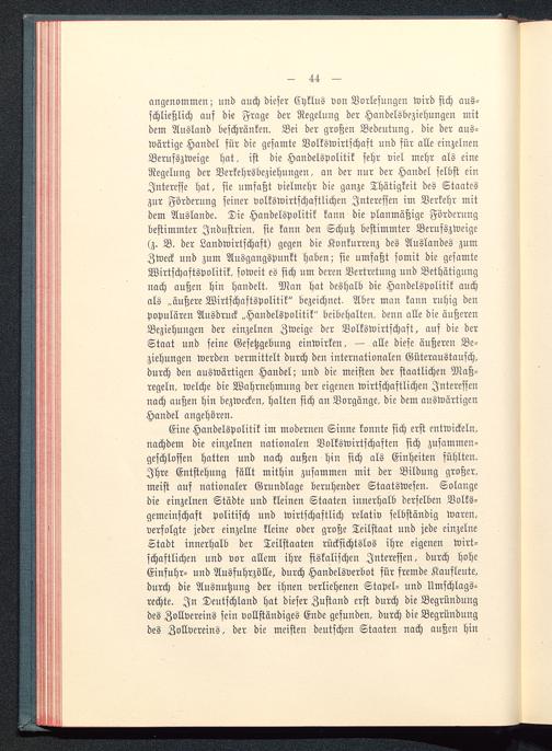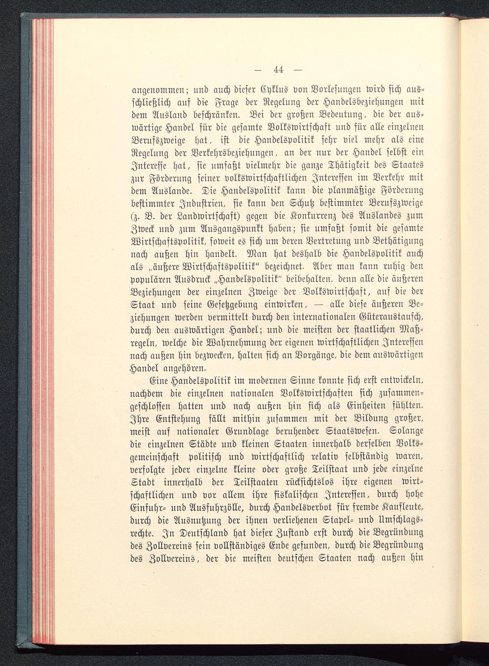 Eine Handelspolitik im modernen Sinne konnte sich erst entwickeln,nachdem die einzelnen nationalen Volkswirtschaften sich zusammen-geschlossen hatten und nach außen hin sich als Einheiten fühlten.Ihre Entstehung fällt mithin zusammen mit der Bildung großer,meist auf nationaler Grundlage beruhender Staatswesen. Solangedie einzelnen Städte und kleinen Staaten innerhalb derselben Volks-gemeinschaft politisch und wirtschaftlich relativ selbständig waren,verfolgte jeder einzelne kleine oder große Teilstaat uud jede einzelneStadt innerhalb der Teilstaaten rücksichtslos ihre eigenen wirt-schaftlichen und vor allem ihre fiskalischen Interessen, durch hoheEinfuhr- und Ausfuhrzölle, durch Handelsverbot für fremde Kaufleute,durch die Ausnutzung der ihnen verliehenen Stapel- und Umschlags-rechte. In Deutschland hat dieser Zustand erst durch die Begründungdes Zollvereins sein vollständiges Ende gefunden, durch die Begründungdes Zollvereins, der die meisten deutschen Staaten nach außen hin