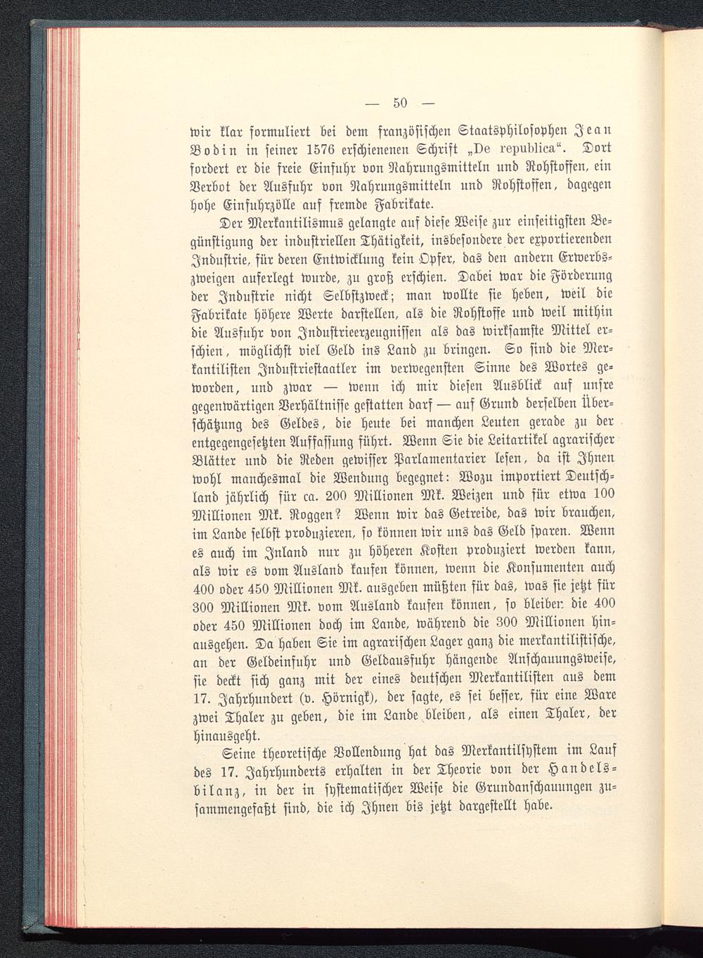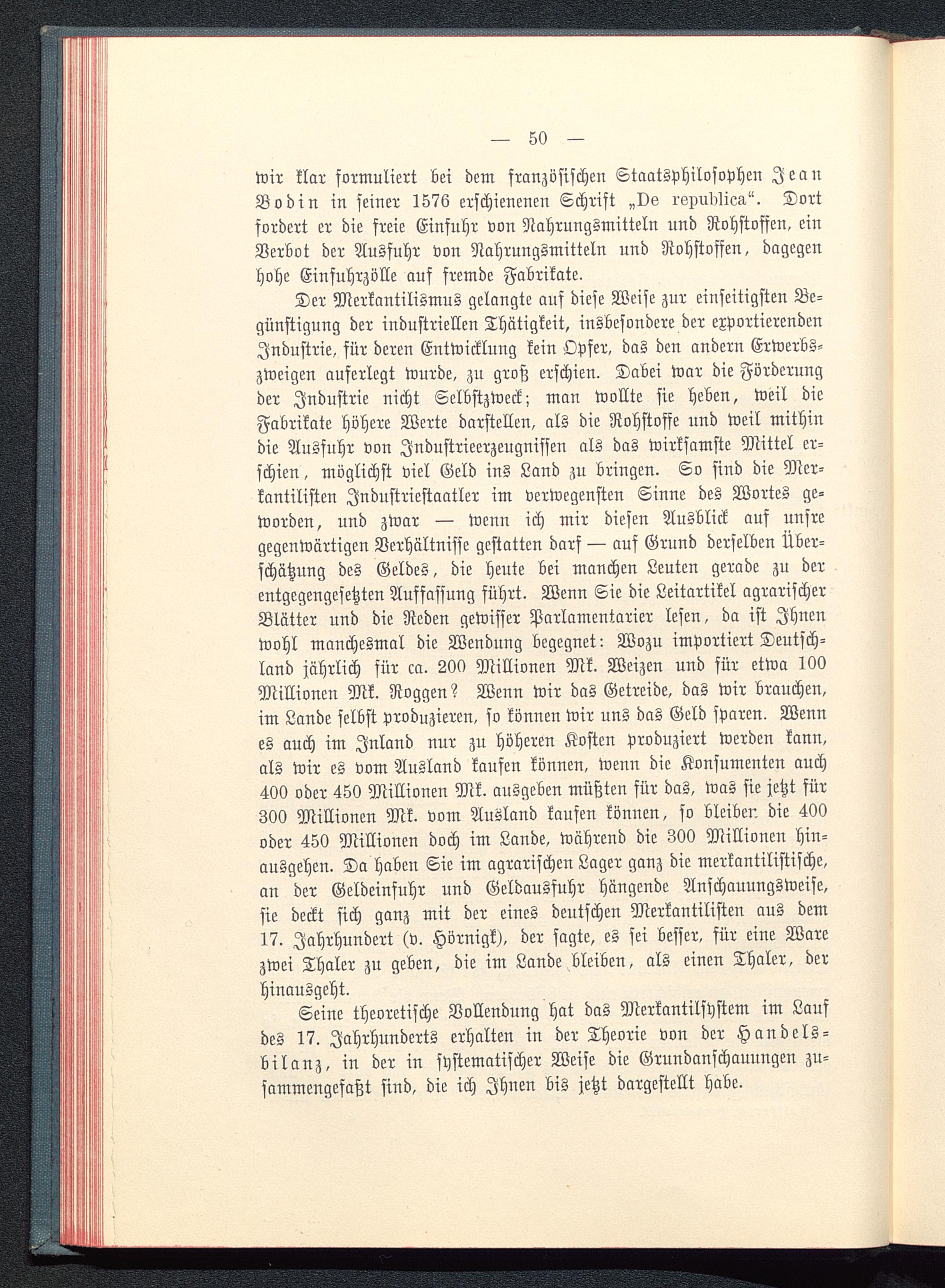 Wir klar formuliert bei dem französischen Staatsphilosophen JeanBodin in seiner 1576 erschienenen Schrift „vs rspunliea". Dortfordert er die freie Einfuhr von Nahrungsmitteln und Rohstoffen, einVerbot der Ausfuhr von Nahrungsmitteln und Rohstoffen, dagegenhohe Einfuhrzölle auf fremde Fabrikate.