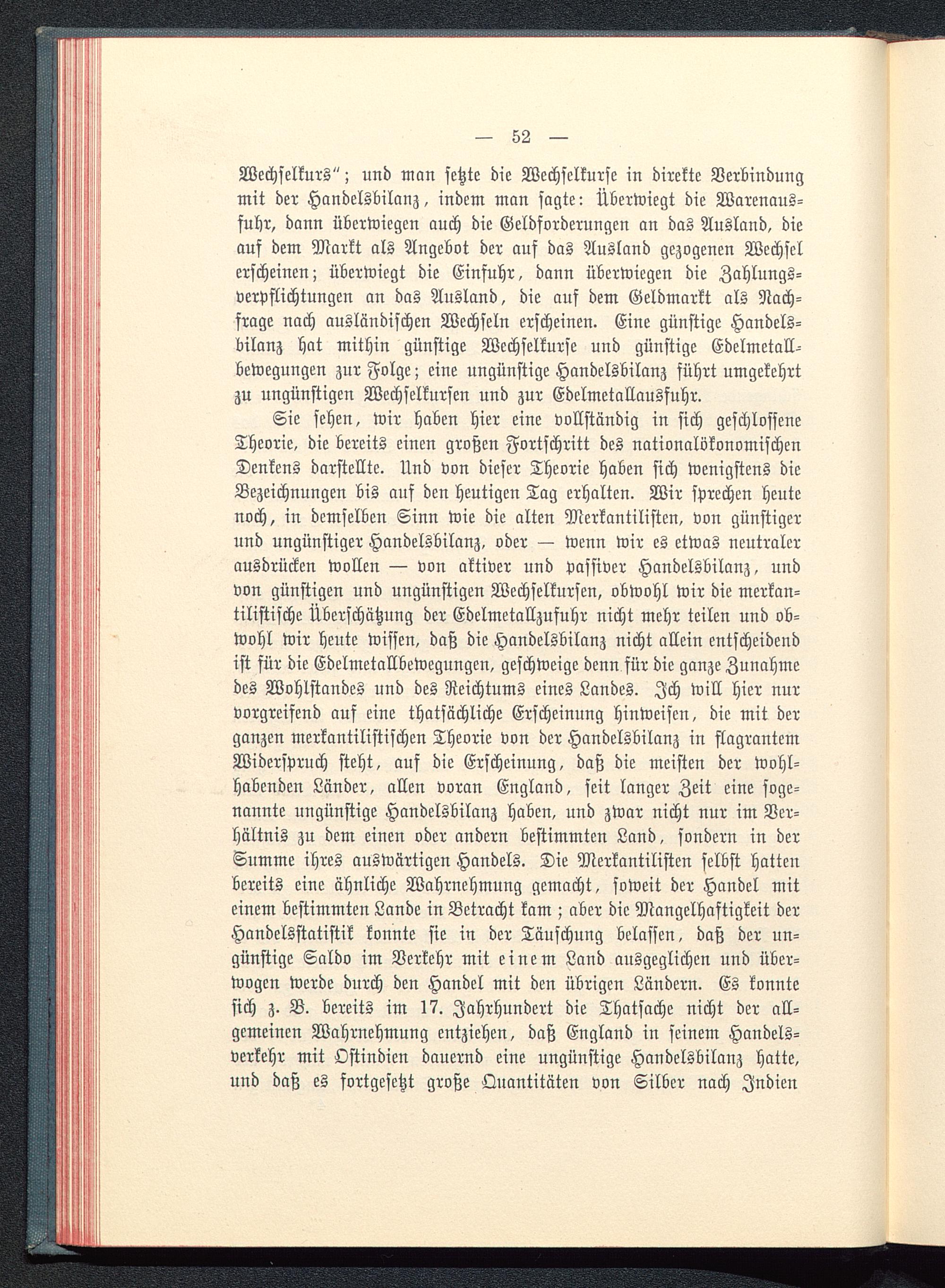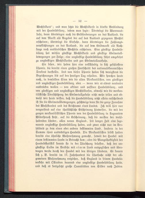 Sie sehen, wir haben hier eine vollständig in sich geschlosseneTheorie, die bereits einen großen Fortschritt des nationalökonomischenDenkens darstellte. Und von dieser Theorie haben sich wenigstens dieBezeichnungen bis auf den heutigen Tag erhalten. Wir sprechen heutenoch, in demselben Sinn wie die alten Merkantilisten, von günstigerund ungünstiger Handelsbilanz, oder — wenn wir es etwas neutralerausdrücken wollen — von aktiver und passiver Handelsbilanz, undvon günstigen und ungünstigen Wechselkursen, obwohl wir die merkan-tilistische Überschätzung der Edelmetallzufuhr nicht mehr teilen und ob-wohl wir heute wissen, daß die Handelsbilanz nicht allein entscheidendist für die Edelmetallbewegungen, geschweige denn sür die ganze Zunahmedes Wohlstandes und des Reichtums eines Landes. Ich will hier nurvorgreifend auf eine thatsächliche Erscheinung hinweisen, die mit derganzen merkantilistischen Theorie von der Handelsbilanz in flagrantemWiderspruch steht, auf die Erscheinung, daß die meisten der wohl-habenden Länder, allen voran England , seit langer Zeit eine soge-nannte ungünstige Handelsbilanz haben, und zwar nicht nur im Ver-hältnis zu dem einen oder andern bestimmten Land, sondern in derSumme ihres auswärtigen Handels. Die Merkantilisten selbst hattenbereits eine ähnliche Wahrnehmung gemacht, soweit der Handel miteinem bestimmten Lande in Betracht kam ; aber die Mangelhaftigkeit derHandelsstatistik konnte sie in der Täuschung belassen, daß der un-günstige Saldo im Verkehr mit einem Land ausgeglichen und über-wogen werde durch den Handel mit den übrigen Ländern. Es konntesich z. B. bereits im 17. Jahrhundert die Thatsache nicht der all-gemeinen Wahrnehmung entziehen, daß England in seinem Handels-verkehr mit Ostindien dauernd eine ungünstige Handelsbilanz hatte,und daß es fortgesetzt große Quantitäten von Silber nach Indien