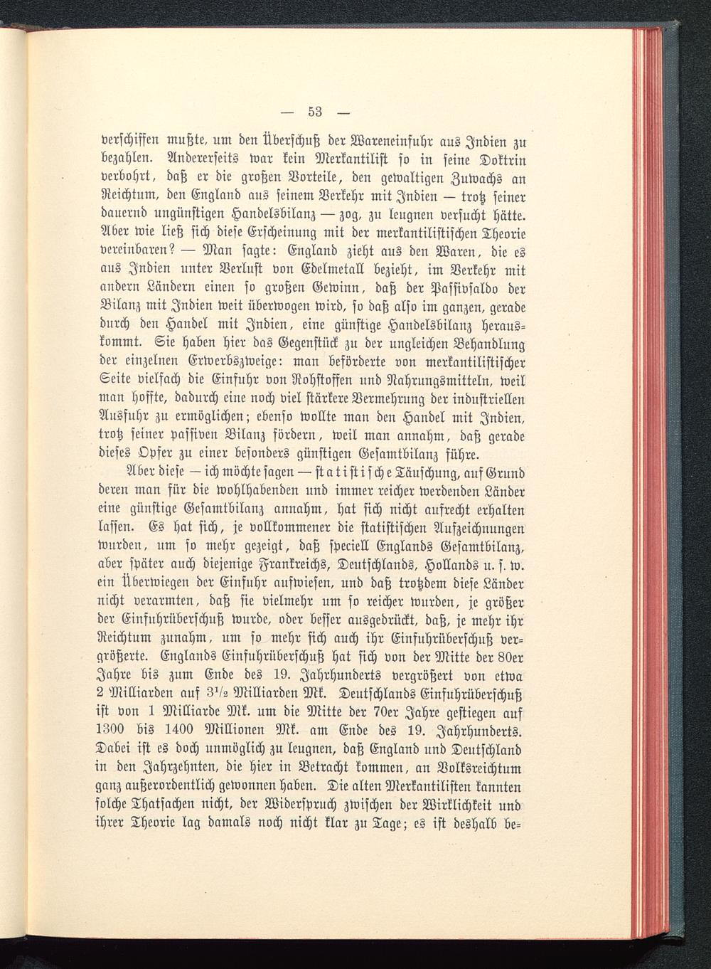 Aber diese — ich möchte sagen — statistische Täuschung, auf Grundderen man für die wohlhabenden und immer reicher werdenden Ländereine günstige Gesamtbilanz annahm, hat sich nicht aufrecht erhaltenlassen. Es hat sich, je vollkommener die statistischen Aufzeichnungenwurden, um so mehr gezeigt, daß speciell Englands Gesamtbilanz,aber später auch diejenige Frankreichs, Deutschlands , Hollands u. s, w.ein Überwiegen der Einfuhr aufwiesen, und daß trotzdem diese Ländernicht verarmten, daß sie vielmehr um so reicher wurden, je größerder Einfuhrüberschuß wurde, oder besser ausgedrückt, daß, je mehr ihrReichtum zunahm, um so mehr sich auch ihr Einfuhrüberschuß ver-größerte. Englands Einfuhrüberschuß hat sich von der Mitte der 80erJahre bis zum Ende des 19. Jahrhunderts vergrößert von etwa2 Milliarden auf 3'/- Milliarden Mk. Deutschlands Einfuhrüberschußist von 1 Milliarde Mk. um die Mitte der 70er Jahre gestiegen auf1300 bis 1400 Millionen Mk. am Ende des 19. Jahrhunderts.Dabei ist es doch unmöglich zu leugnen, daß England nnd Deutschland in den Jahrzehnten, die hier in Betracht kommen, an Volksreichtumganz außerordentlich gewonnen haben. Die alten Merkantilisten kanntensolche Thatsachen nicht, der Widerspruch zwischen der Wirklichkeit undihrer Theorie lag damals noch nicht klar zu Tage; es ist deshalb be-