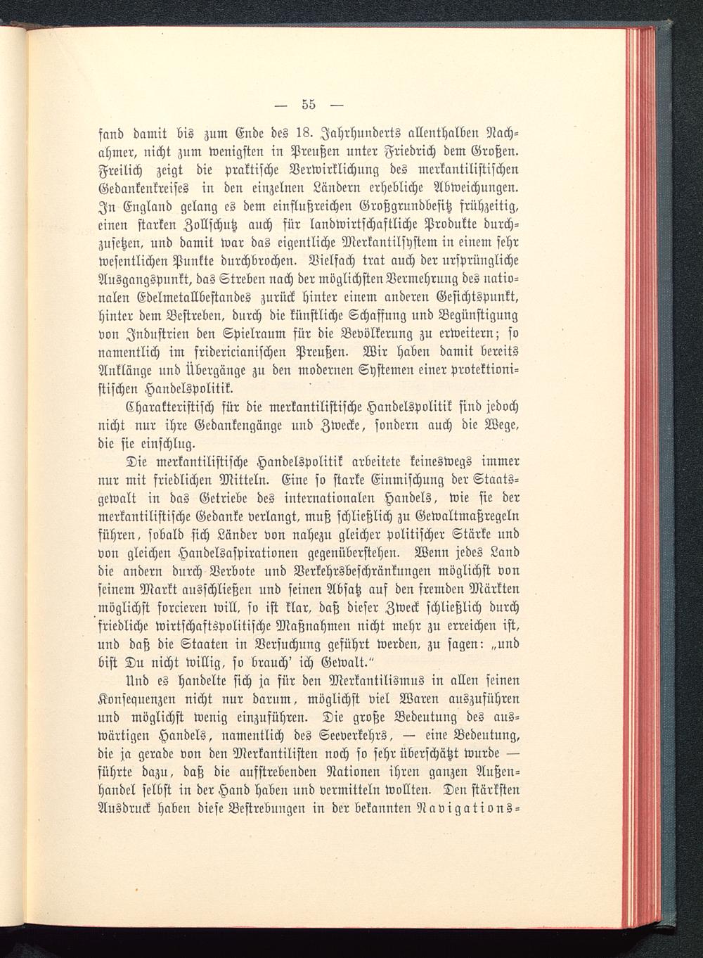 Die merkantilistische Handelspolitik arbeitete keineswegs immernur mit friedlichen Mitteln. Eine so starke Einmischung der Staats-gewalt in das Getriebe des internationalen Handels, wie sie dermerkantilistische Gedanke verlangt, muß schließlich zu Gewaltmaßregelnführen, sobald sich Länder von nahezu gleicher politischer Stärke undvon gleichen Handelsaspirationen gegenüberstehen. Wenn jedes Landdie andern durch Verbote und Verkehrsbeschränkungen möglichst vonseinem Markt ausschließen und seinen Absatz auf den fremden Märktenmöglichst forcieren will, so ist klar, daß dieser Zweck schließlich durchfriedliche wirtschaftspolitische Maßnahmen nicht mehr zu erreichen ist,und daß die Staaten in Versuchung geführt werden, zu sagen: „undbist Du nicht willig, so brauch' ich Gewalt."