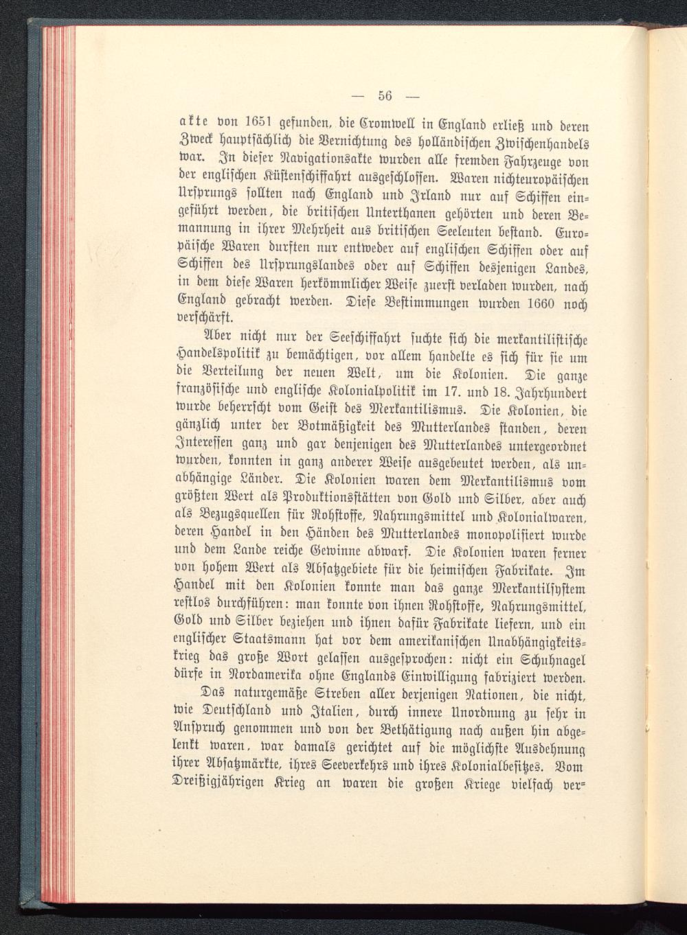 akte von 1651 gefunden, die Cromwell in England erließ und derenZweck hauptsächlich die Vernichtung des holländischen Zwischenhandelswar. In dieser Navigationsakte wurden alle fremden Fahrzeuge vonder englischen Küstenschiffahrt ausgeschlossen. Waren nichteuropäischenUrsprungs sollten nach England und Irland nur auf Schiffen ein-geführt werden, die britischen Unterthanen gehörten und deren Be-mannung in ihrer Mehrheit aus britischen Seeleuten bestand. Euro-päische Waren durften nur entweder auf englischen Schiffen oder aufSchiffen des Ursprungslandes oder auf Schiffen desjenigen Landes,in dem diese Waren herkömmlicher Weise zuerst verladen wurden, nachEngland gebracht werden. Diese Bestimmungen wurden 1660 nochverschärft.