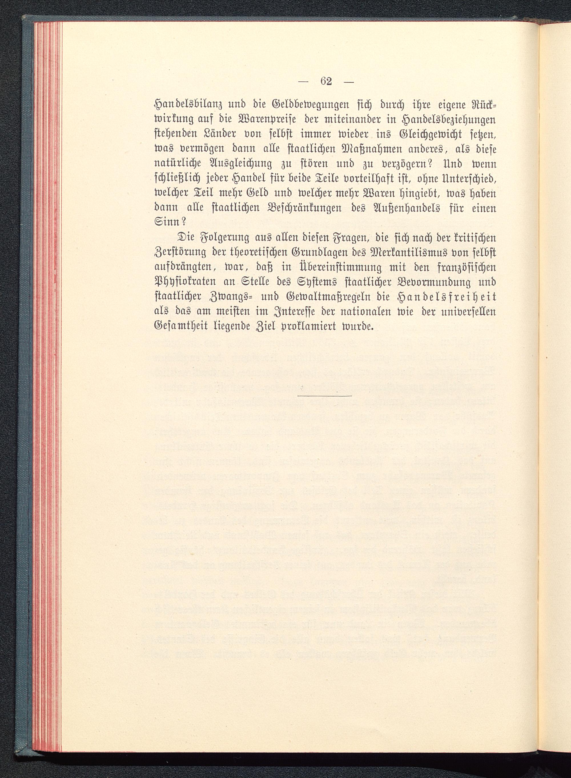 Die Folgerung aus allen diesen Fragen, die sich nach der kritischenZerstörung der theoretischen Grundlagen des Merkantilismus von selbstaufdrängten, war, daß in Übereinstimmung mit den französischenPhystokraten an Stelle des Systems staatlicher Bevormundung undstaatlicher Zwangs- und Gewaltmaßregeln die Handelsfreiheitals das am meisten im Interesse der nationalen wie der universellenGesamtheit liegende Ziel proklamiert wurde.