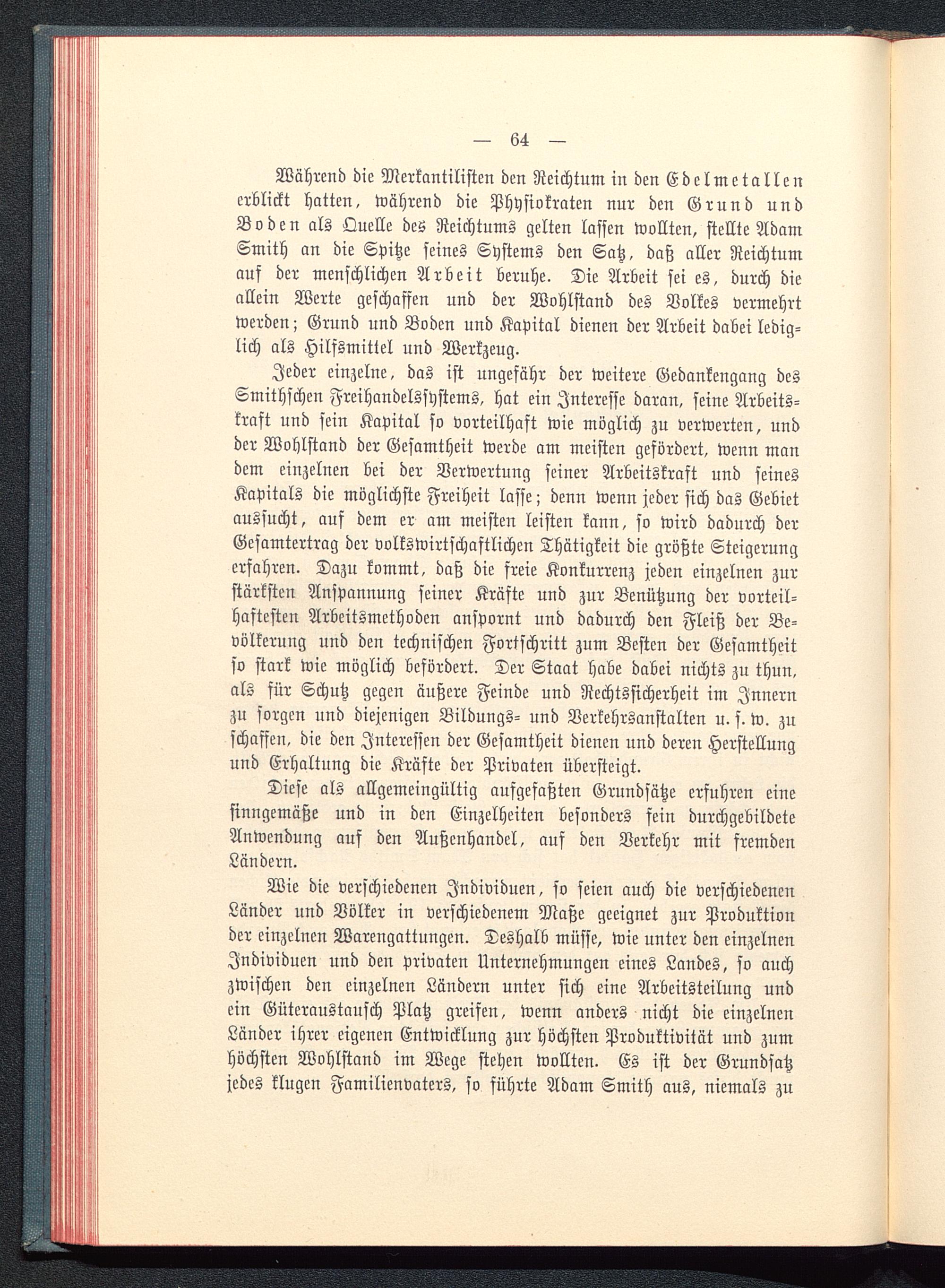 Wie die verschiedenen Individuen, so seien auch die verschiedenenLänder und Völker in verschiedenem Maße geeignet zur Produktionder einzelnen Warengattungen. Deshalb müsse, wie unter den einzelnenIndividuen und den privaten Unternehmungen eines Landes, so auchzwischen den einzelnen Ländern unter sich eine Arbeitsteilung undein Güteraustausch Platz greifen, wenn anders nicht die einzelnenLänder ihrer eigenen Entwicklung zur höchsten Produktivität und zumhöchsten Wohlstand im Wege stehen wollten. Es ist der Grundsatzjedes klugen Familienvaters, so führte Adam Smith aus, niemals zu