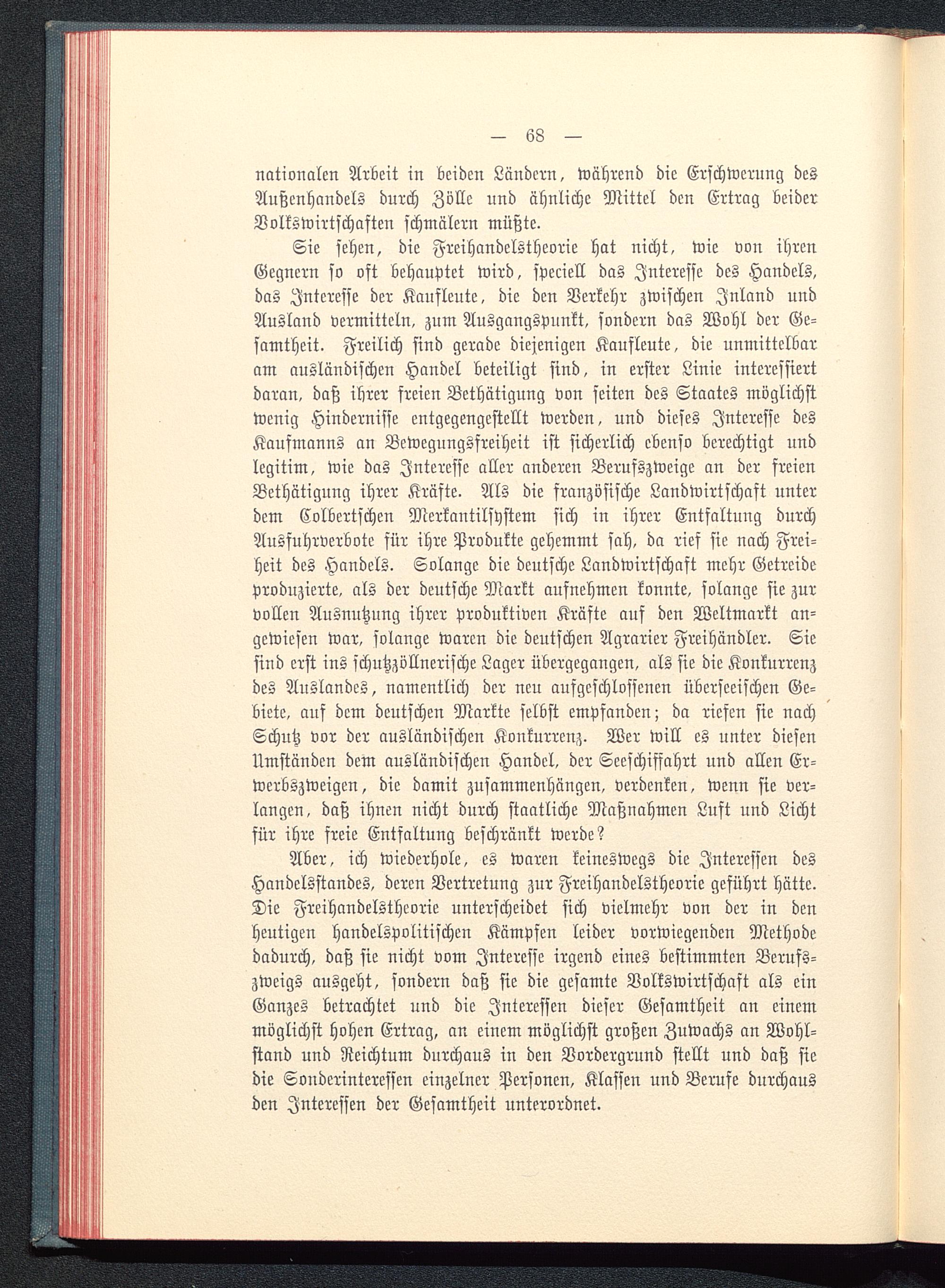 Aber, ich wiederhole, es waren keineswegs die Interessen desHandelsstandes, deren Vertretung zur Freihandelstheorie geführt hätte.Die Freihandelstheorie unterscheidet sich vielmehr von der in denheutigen handelspolitischen Kämpfen leider vorwiegenden Methodedadurch, daß sie nicht vom Interesse irgend eines bestimmten Berufs-zweigs ausgeht, sondern daß sie die gesamte Volkswirtschaft als einGanzes betrachtet und die Jnterefsen dieser Gesamtheit an einemmöglichst hohen Ertrag, an einem möglichst großen Zuwachs an Wohl-stand und Reichtum durchaus in den Vordergrund stellt und daß siedie Sonderintercssen einzelner Personen, Klassen und Berufe durchausden Interessen der Gesamtheit unterordnet.