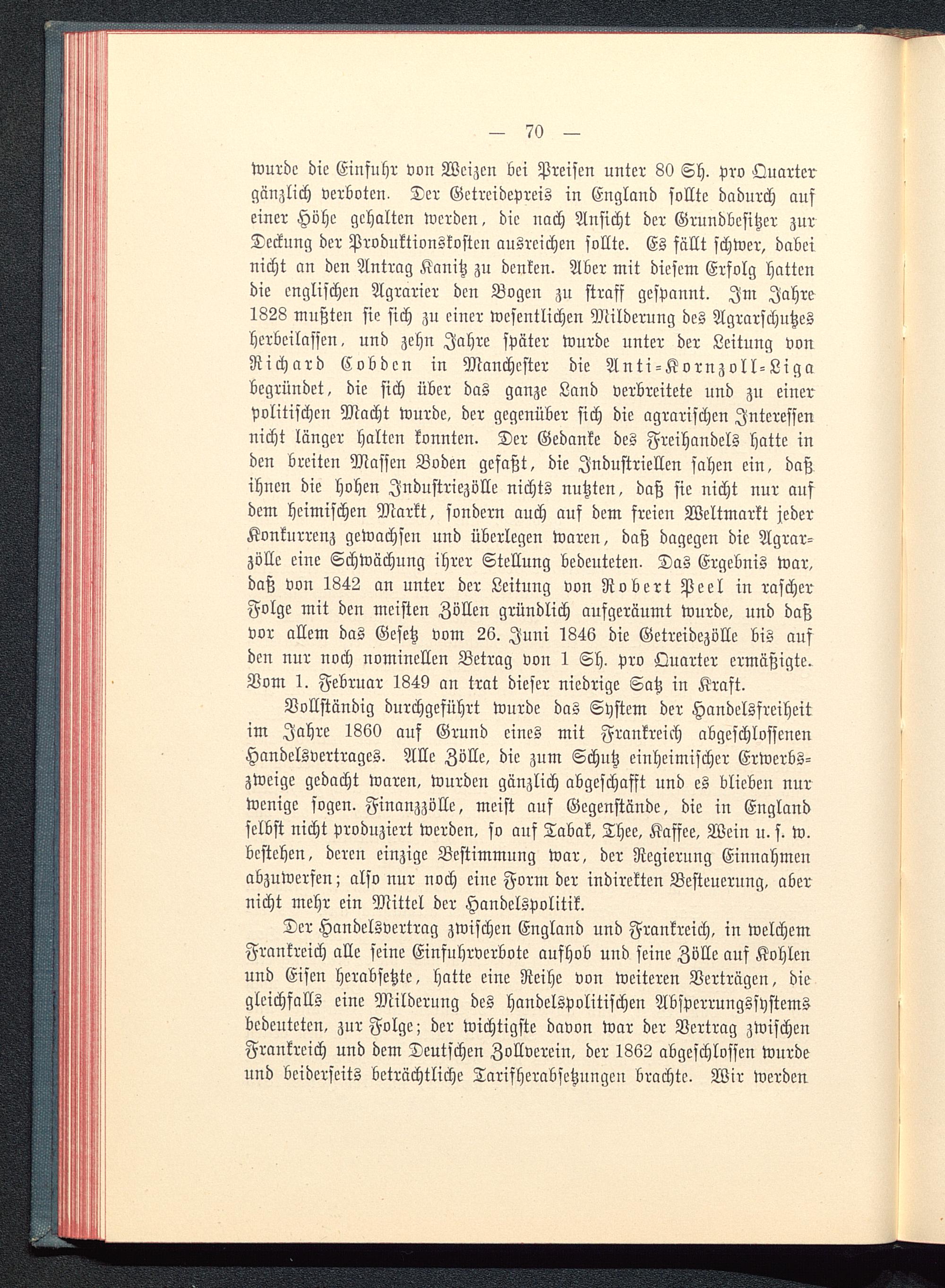Wurde die Einfuhr von Weizen bei Preisen unter 80 Sh. Pro Quartergänzlich verboten. Der Getreidepreis in England sollte dadurch aufeiner Höhe gehalten werden, die nach Ansicht der Grundbesitzer zurDeckung der Produktionskosten ausreichen sollte. Es fällt schwer, dabeinicht an den Antrag Kanitz zu denken. Aber mit diesem Erfolg hattendie englischen Agrarier den Bogen zu straff gespannt. Im Jahre1828 mußten sie sich zu einer wesentlichen Milderung des Agrarschutzesherbeilassen, und zehn Jahre später wurde unter der Leitung vonRichard Cobdcn in Manchester die Anti-Kornzoll-Ligabegründet, die sich über das ganze Land verbreitete und zu einerpolitischen Macht wurde, der gegenüber sich die agrarischen Interessennicht länger halten konnten. Der Gedanke des Freihandels hatte inden breiten Massen Boden gefaßt, die Industriellen sahen ein, daßihnen die hohen Jndustriezölle nichts nutzten, daß sie nicht nur aufdem heimischen Markt, sondern auch auf dem freien Weltmarkt jederKonkurrenz gewachsen und überlegen waren, daß dagegen die Agrar-zölle eine Schwächung ihrer Stellung bedeuteten. Das Ergebnis war,daß von 1842 an unter der Leitung von Robert Peel in rascherFolge mit den meisten Zöllen gründlich aufgeräumt wurde, und daßvor allem das Gesetz vom 26. Juni 1846 die Getreidezölle bis aufden nur noch nominellen Betrag von 1 Sh. pro Quarter ermäßigte.Vom 1. Februar 1849 an trat dieser niedrige Satz in Kraft.
