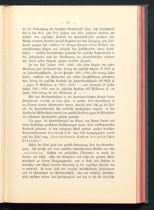 Die gegen die Handelsfreiheit im Sinne von Adam Smith undseiner Nachfolger gerichteten Anschauungen haben ihren vollkommenstenAusdruck gefunden in dem bekannten Werk unseres großen deutschen Nationalökonomen Friedrich List , das 1841 herausgegeben wurdeund den Titel trug „Das nationale System der politischenÖkonomie".