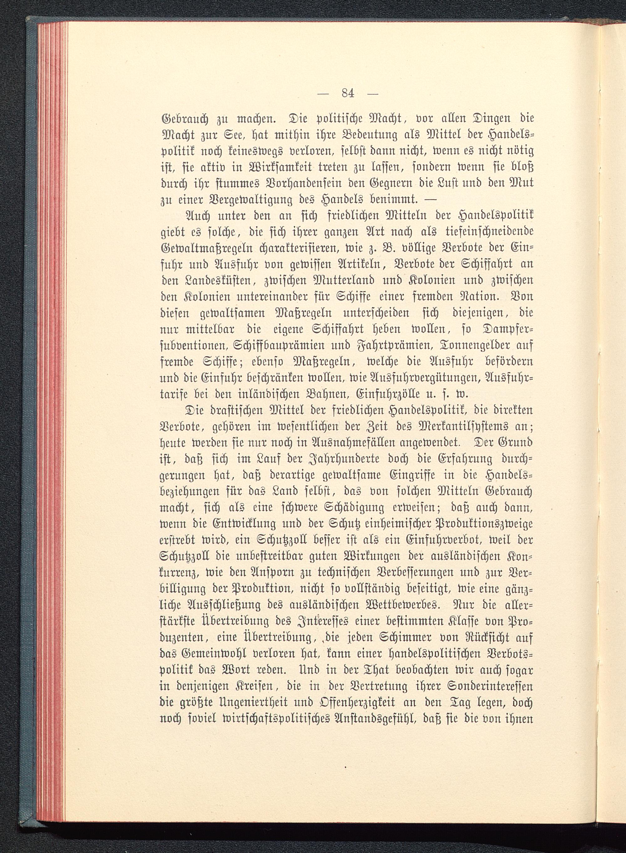 Auch unter den an sich friedlichen Mitteln der Handelspolitikgiebt es solche, die sich ihrer ganzen Art nach als tiefeinschneidendeGewaltmaßrcgeln charakterisieren, wie z. B. völlige Verbote der Ein-fuhr und Ausfuhr von gewissen Artikeln, Verbote der Schiffahrt anden Landesküsten, zwischen Mutterland und Kolonien und zwischenden Kolonien untereinander für Schiffe einer fremden Nation. Vondiesen gewaltsamen Maßregeln unterscheiden sich diejenigen, dienur mittelbar die eigene Schiffahrt heben wollen, so Dampfer-subventionen, Schiffbauprämien und Fahrtprämien, Tonnengelder auffremde Schiffe; ebenso Maßregeln, welche die Ausfuhr befördernund die Einfuhr beschränken wollen, wie Ausfuhrvergütungen, Ausfuhr-tarife bei den inländischen Bahnen, Einfuhrzölle u. f. w.