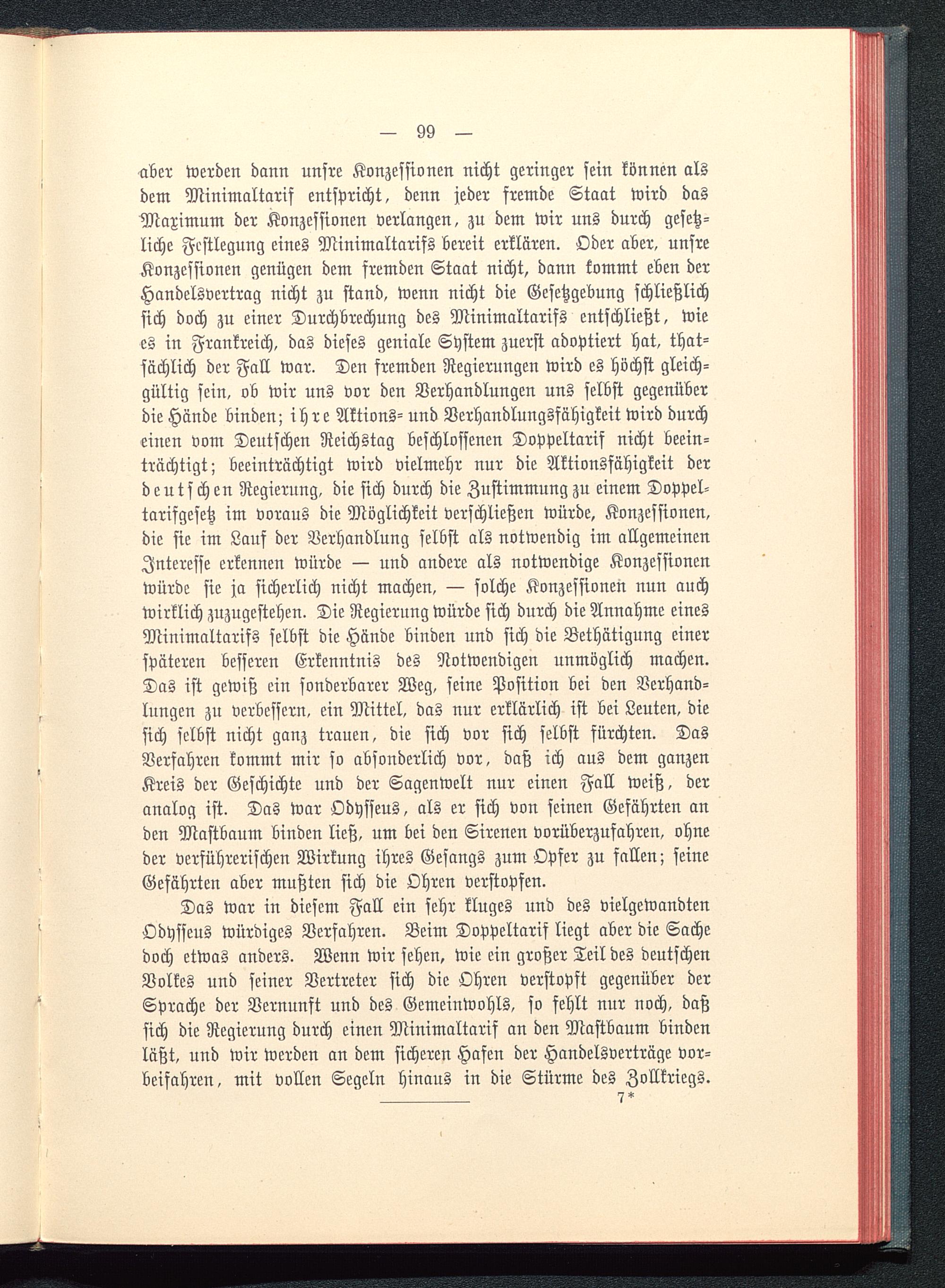Das war in diesem Fall ein sehr kluges und des vielgewandtenOdysseus würdiges Verfahren. Beim Doppeltarif liegt aber die Sachedoch etwas anders. Wenn wir sehen, wie ein großer Teil des deutschenVolkes und seiner Vertreter sich die Ohren verstopft gegenüber derSprache der Vernunft und des Gemeinwohls, so fehlt nur noch, daßsich die Regierung durch einen Minimaltarif an den Mastbaum bindenläßt, und wir werden an dem sicheren Hafen der Handelsverträge vor-beifahren, mit vollen Segeln hinaus in die Stürme des Zollkriegs.