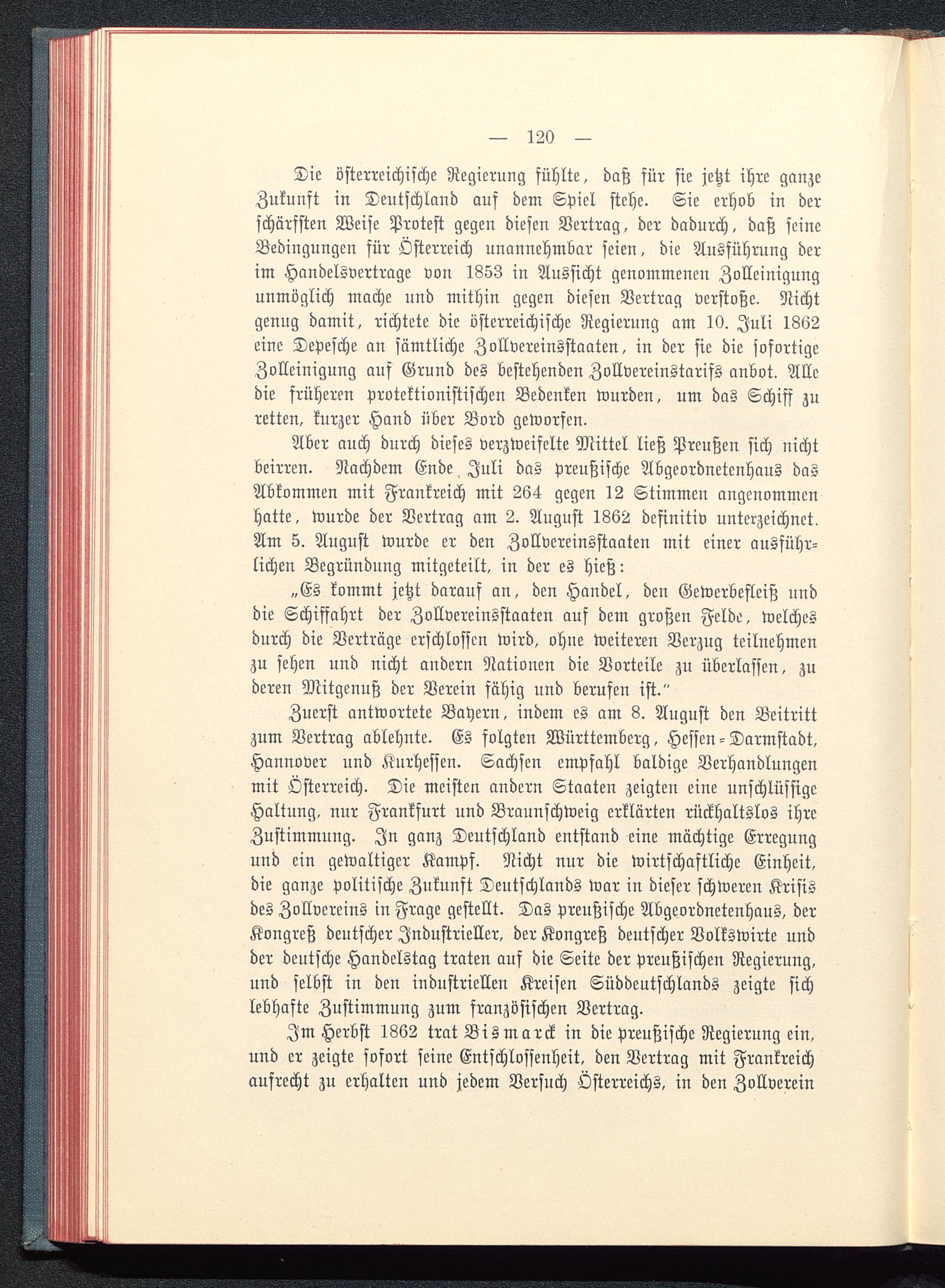 Zuerst antwortete Bayern , indem es am 8. August den Beitrittzum Vertrag ablehnte. Es folgten Württemberg , Hessen-Darmstadt,Hannover und Kurhessen . Sachsen empfahl baldige Verhandlungenmit Österreich . Die meisten andern Staaten zeigten eine unschlüssigeHaltung, nur Frankfurt und Braunschweig erklärten rückhaltslos ihreZustimmung. In ganz Deutschland entstand eine mächtige Erregungund ein gewaltiger Kampf. Nicht nur die wirtschaftliche Einheit,die ganze politische Zukunft Deutschlands war in dieser schweren Krisisdes Zollvereins in Frage gestellt. Das preußische Abgeordnetenhaus, derKongreß deutscher Industrieller, der Kongreß deutscher Volkswirte undder deutsche Handelstag traten auf die Seite der preußischen Regierung,und selbst in den industriellen Kreisen Süddeutschlands zeigte sichlebhafte Zustimmung zum französischen Vertrag.