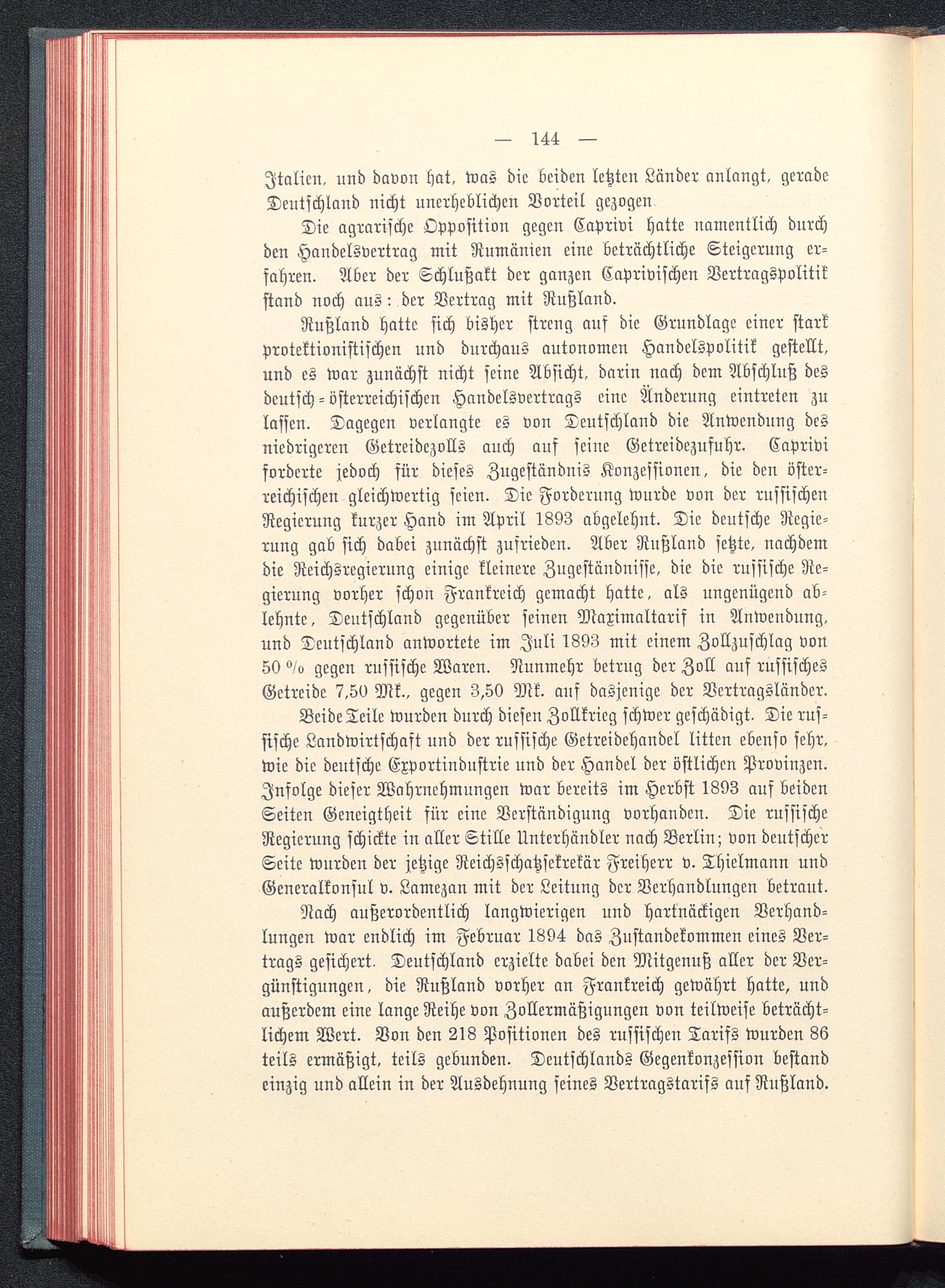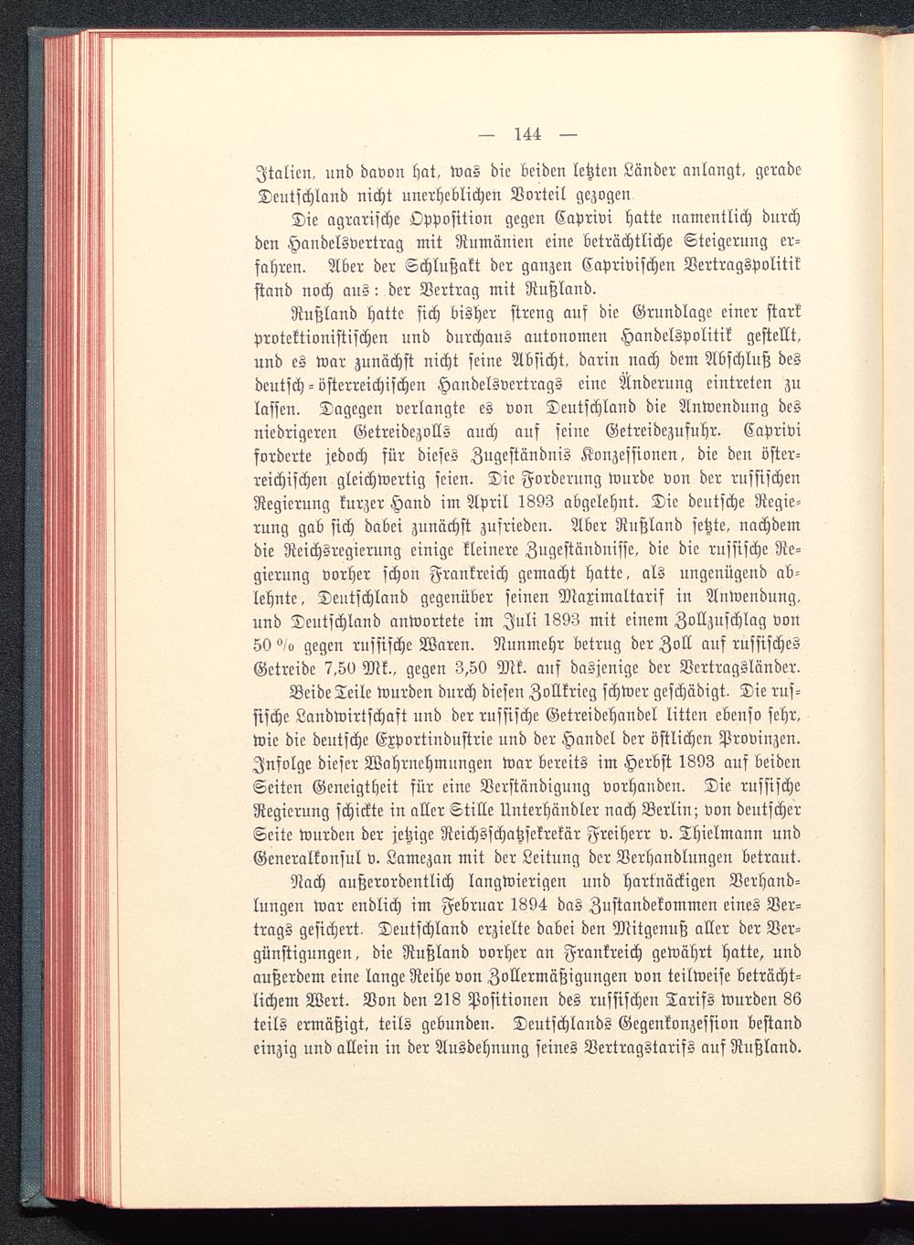 Beide Teile wurden durch diesen Zollkrieg schwer geschädigt. Die rus-sische Landwirtschast und der russische Getreidehandel litten ebenso sehr,wie die deutsche Exportindustrie und der Handel der östlichen Provinzen.Infolge dieser Wahrnehmungen war bereits im Herbst 1893 auf beidenSeiten Geneigtheit für eine Verständigung vorhanden. Die russische Regierung schickte in aller Stille Unterhändler nach Berlin; von deutscher Seite wurden der jetzige Reichsschatzsekrekär Freiherr v. Thielmann undGeneralkonsul v. Lamczan mit der Leitung der Verhandlungen betraut.
